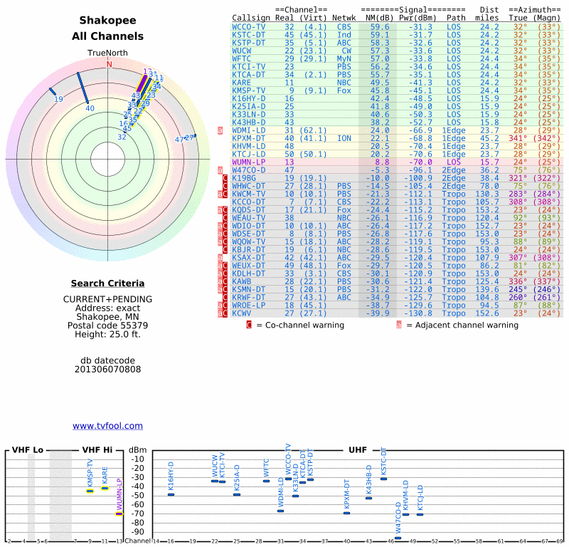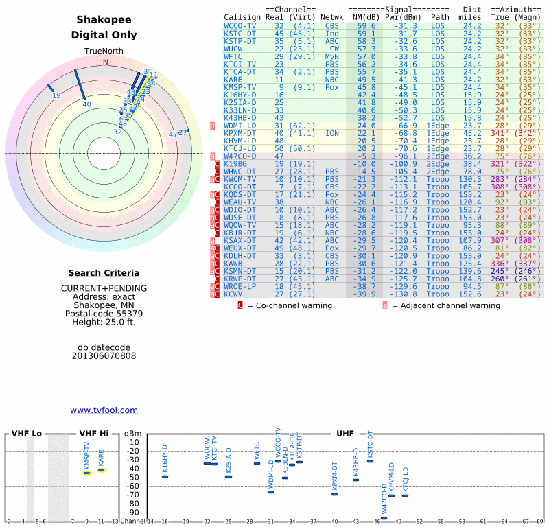 Here are the results for your location. The transmitter database was last updated on June 7, 2013. For more information about these plots and how to interpret them, please check out the Signal Analysis FAQ.