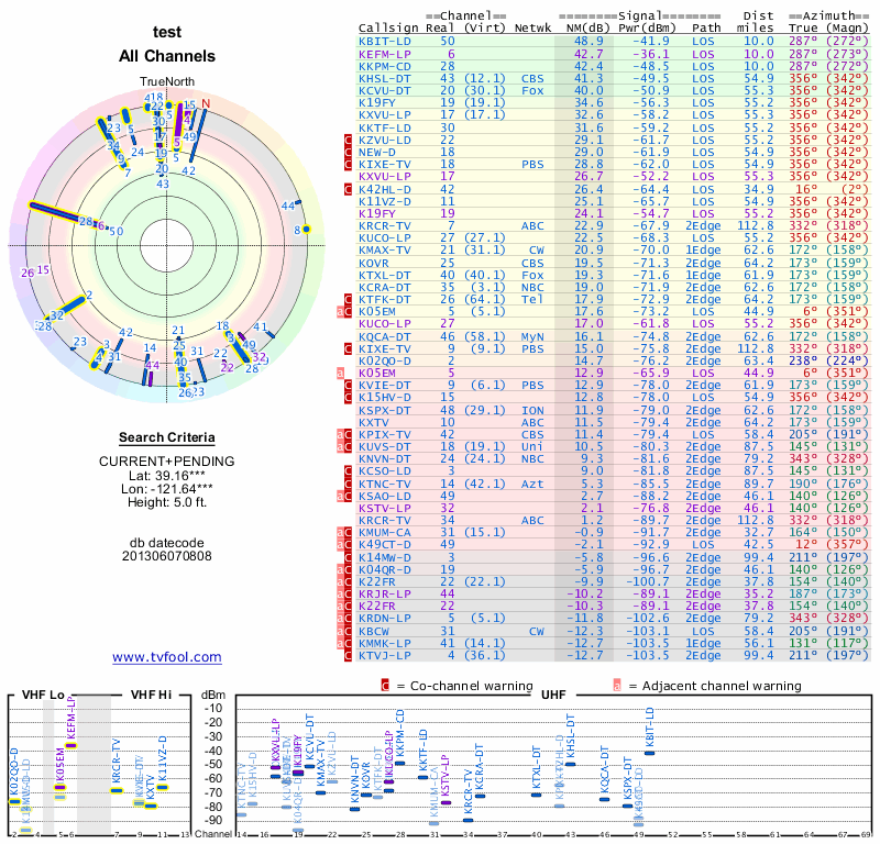 Here are the results for your location. The transmitter database was last updated on June 7, 2013. For more information about these plots and how to interpret them, please check out the Signal Analysis FAQ.