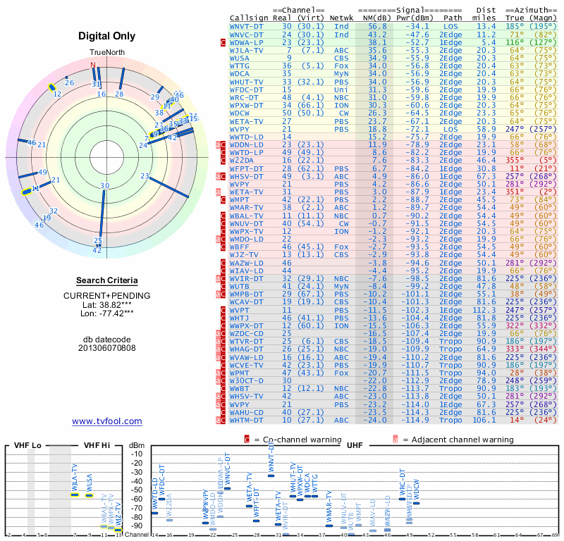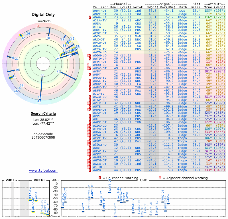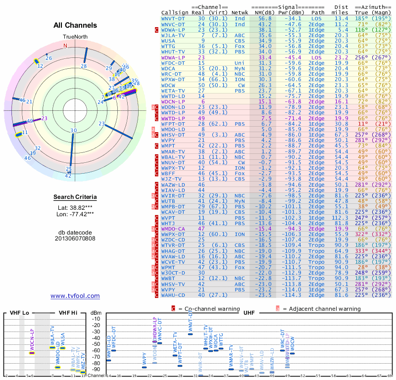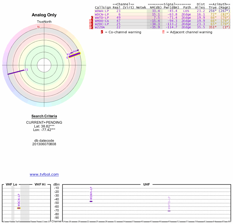 Here are the results for your location. The transmitter database was last updated on June 7, 2013. For more information about these plots and how to interpret them, please check out the Signal Analysis FAQ.