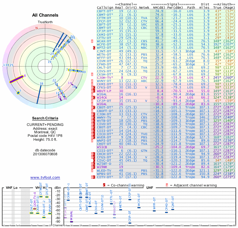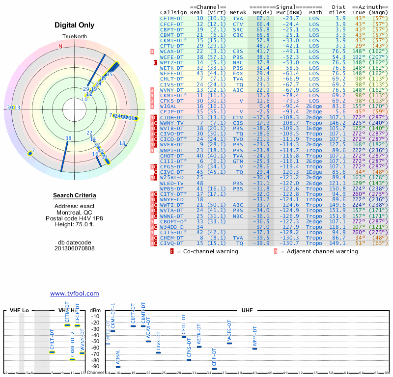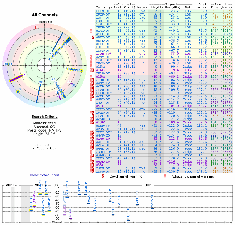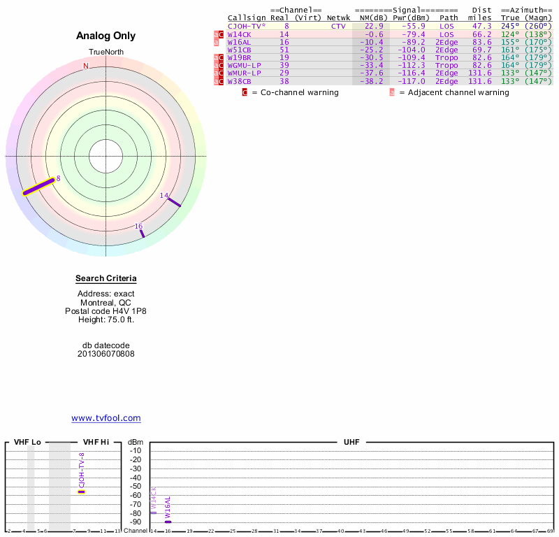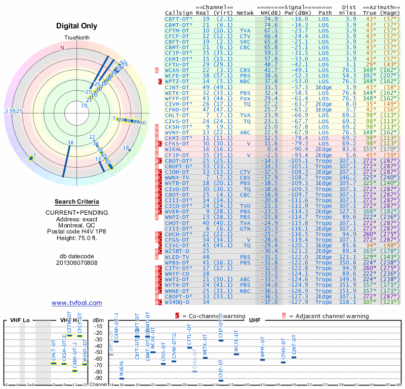 Here are the results for your location. The transmitter database was last updated on June 7, 2013. For more information about these plots and how to interpret them, please check out the Signal Analysis FAQ.