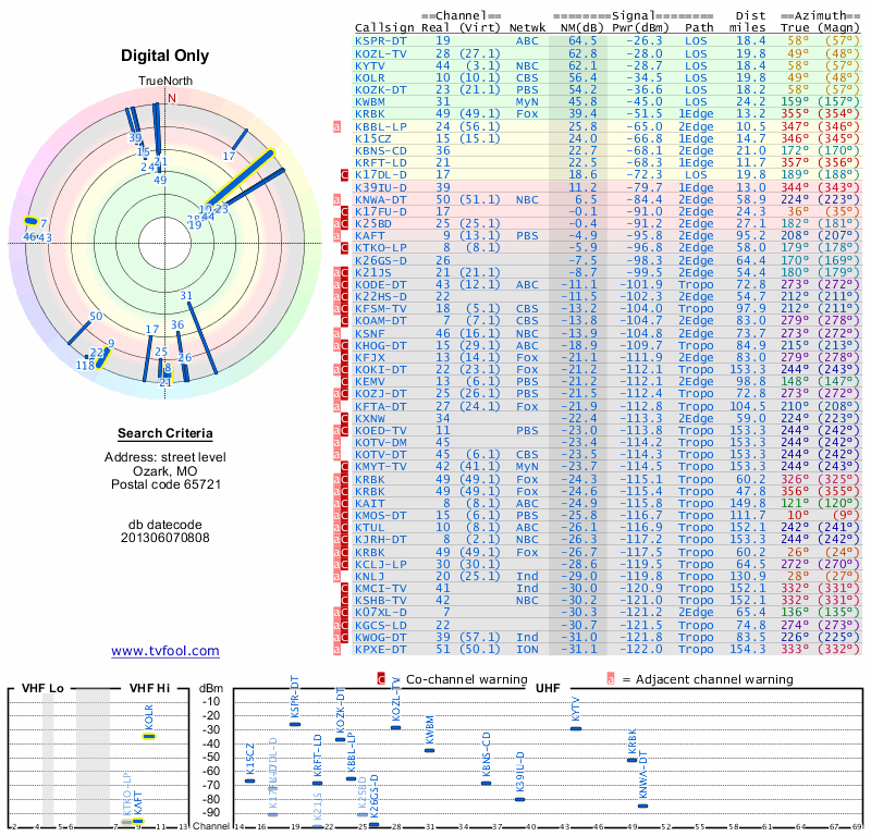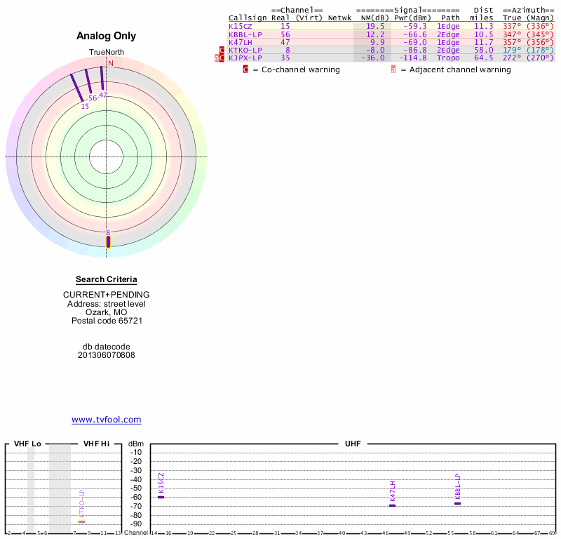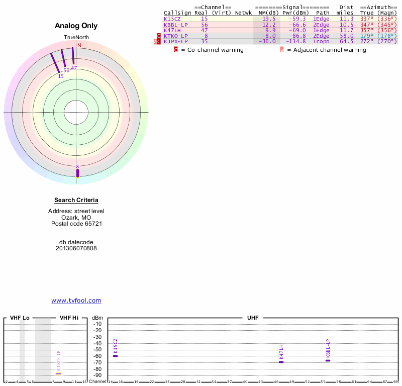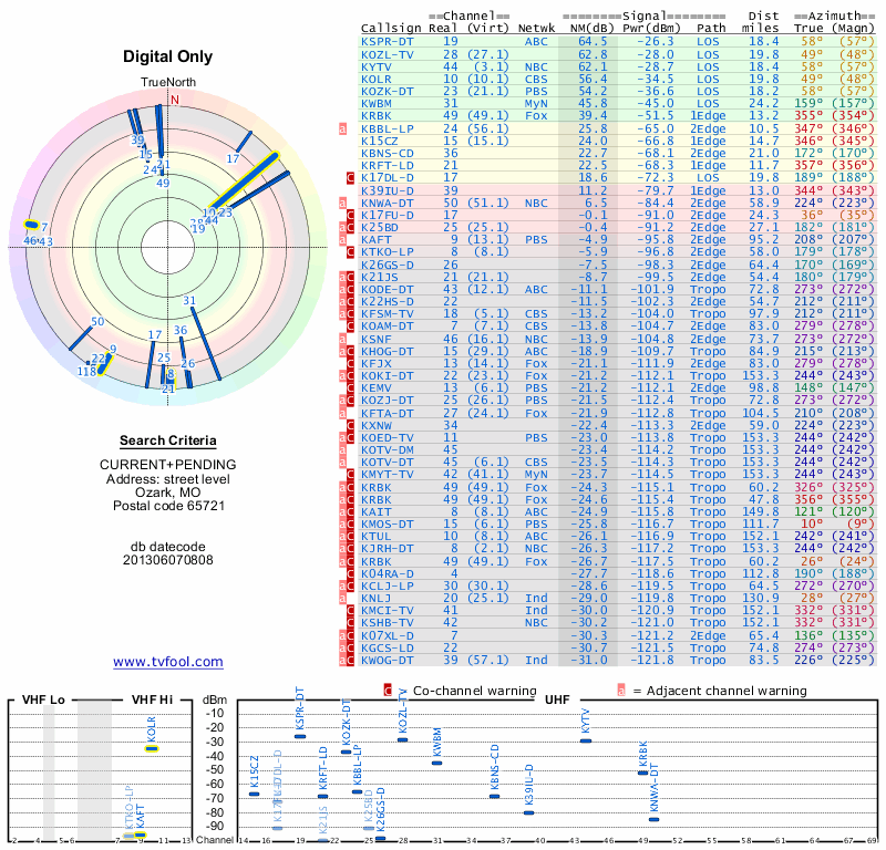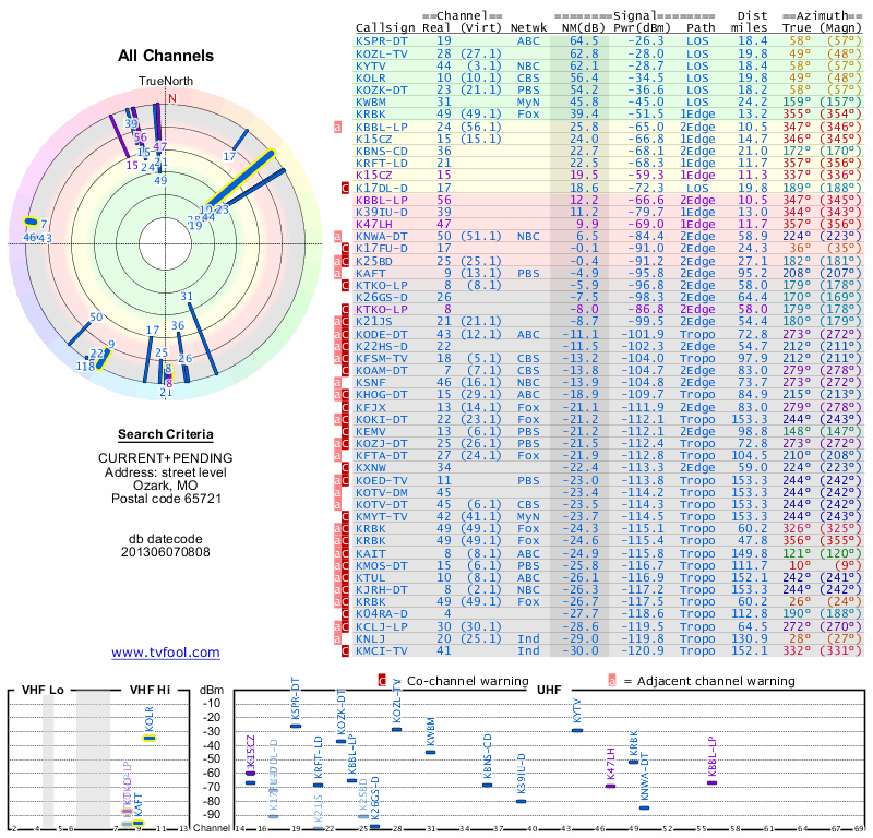Here are the results for your location. The transmitter database was last updated on June 7, 2013. For more information about these plots and how to interpret them, please check out the Signal Analysis FAQ.