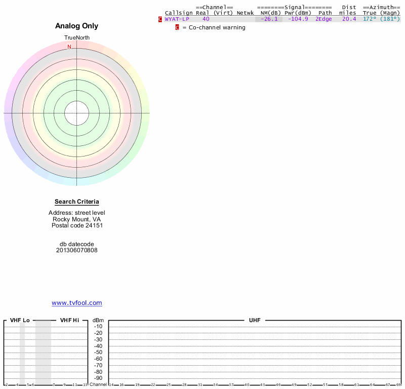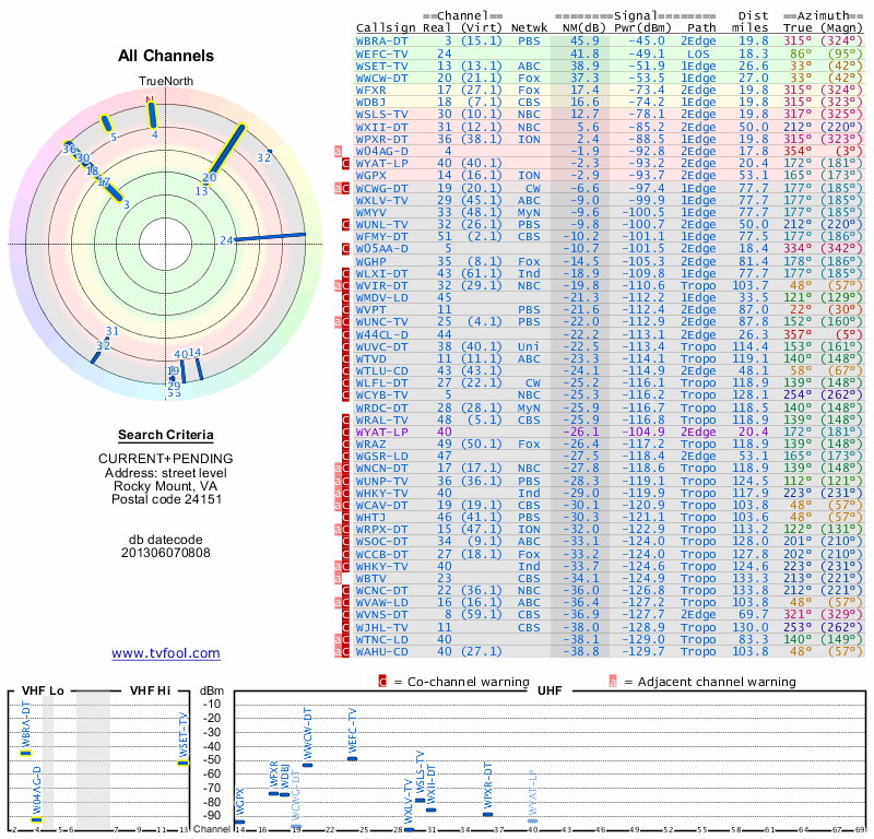 Here are the results for your location. The transmitter database was last updated on June 7, 2013. For more information about these plots and how to interpret them, please check out the Signal Analysis FAQ.