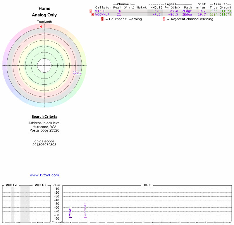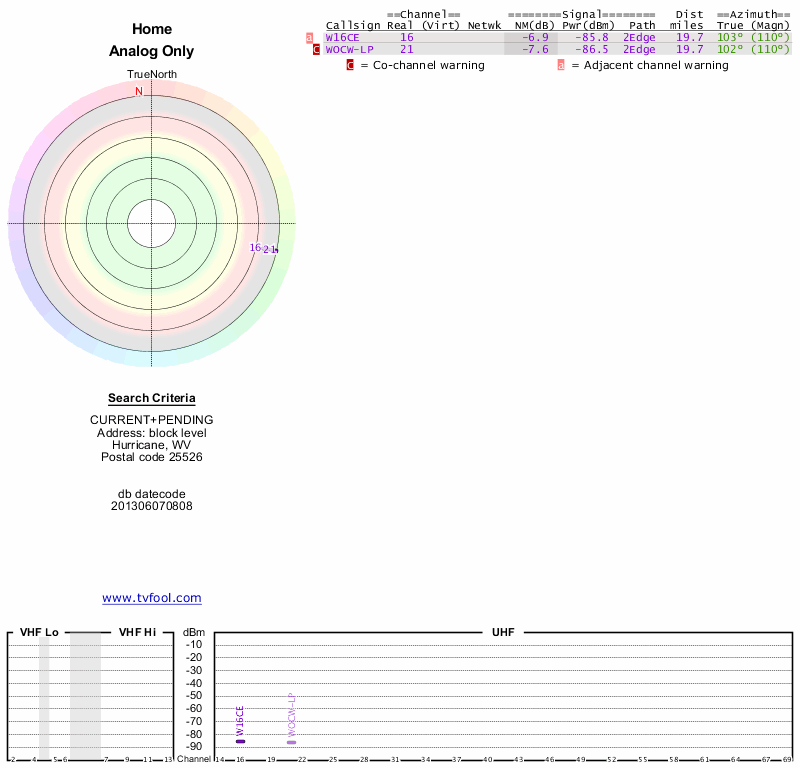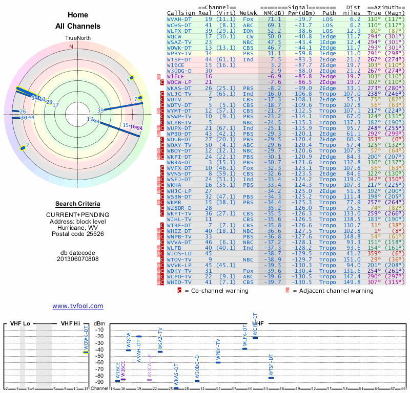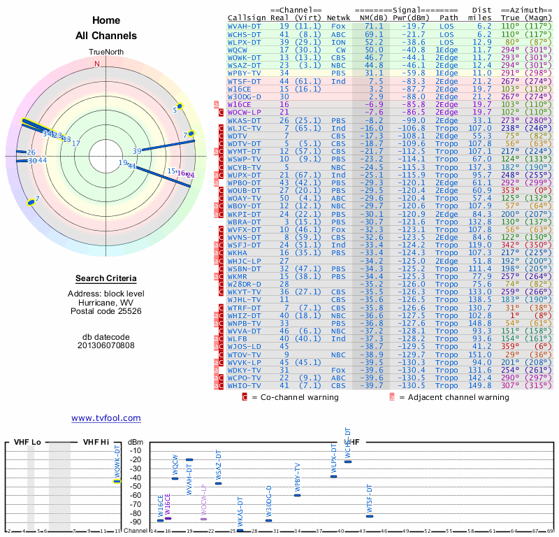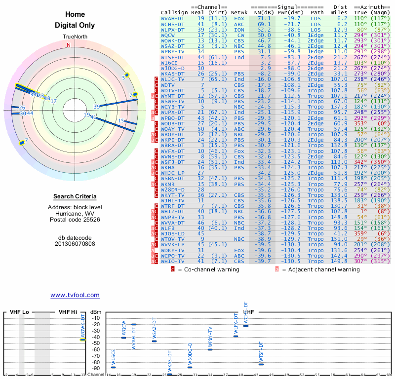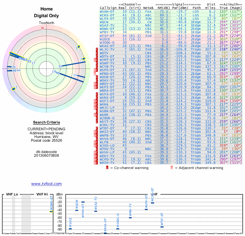 Here are the results for your location. The transmitter database was last updated on June 7, 2013. For more information about these plots and how to interpret them, please check out the Signal Analysis FAQ.