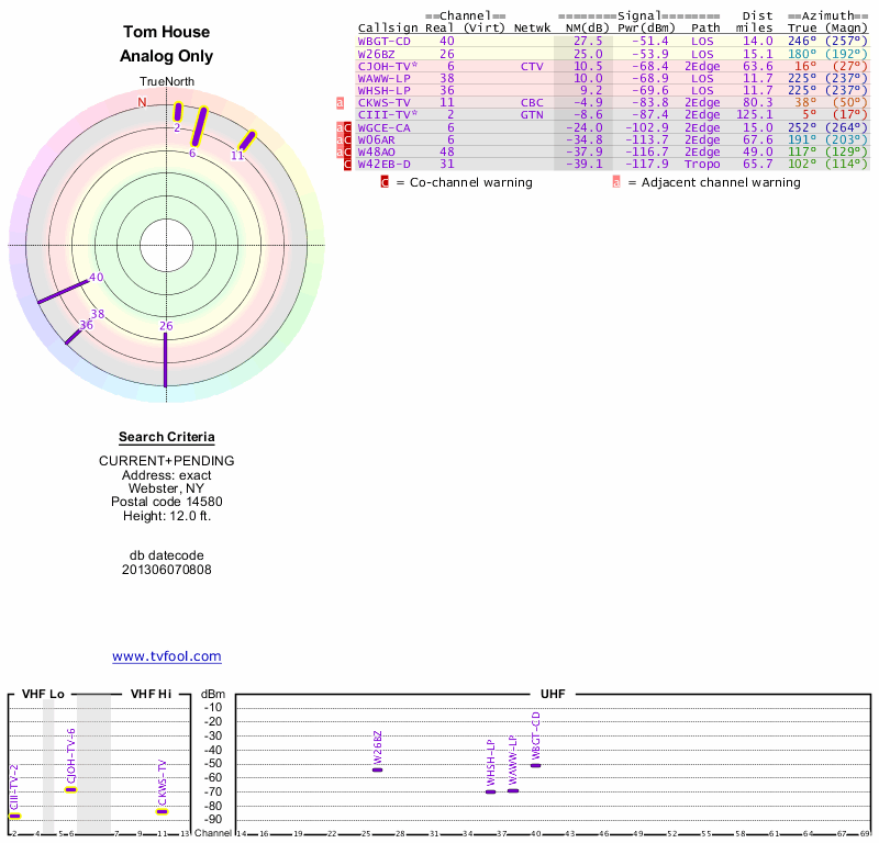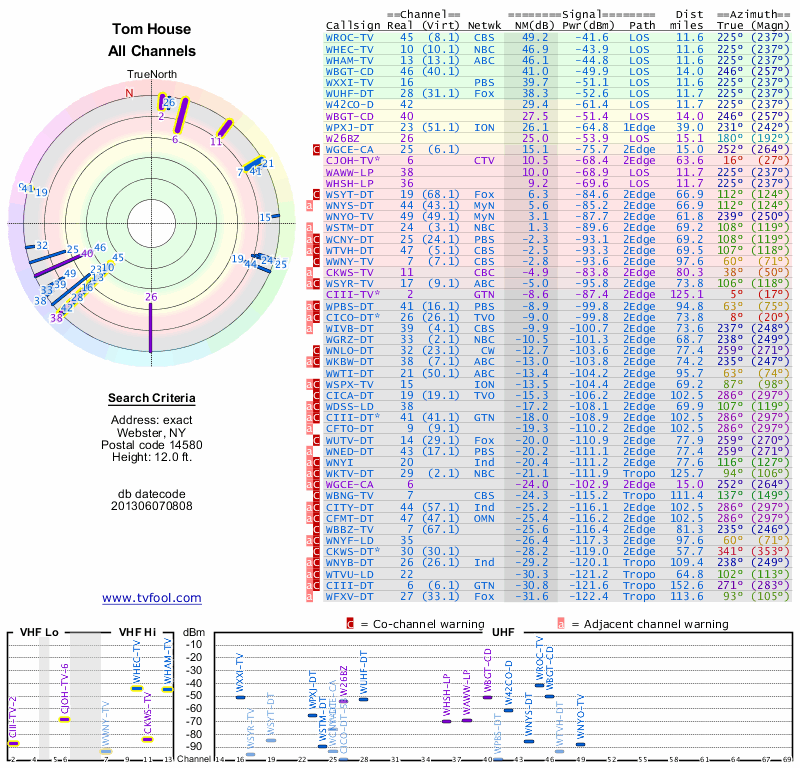 Here are the results for your location. The transmitter database was last updated on June 7, 2013. For more information about these plots and how to interpret them, please check out the Signal Analysis FAQ.