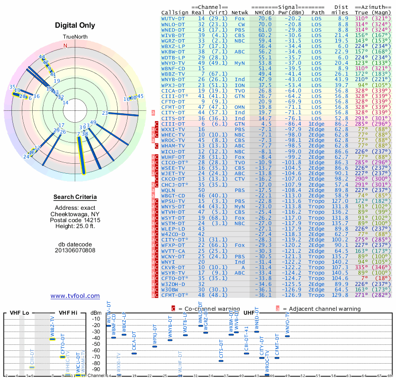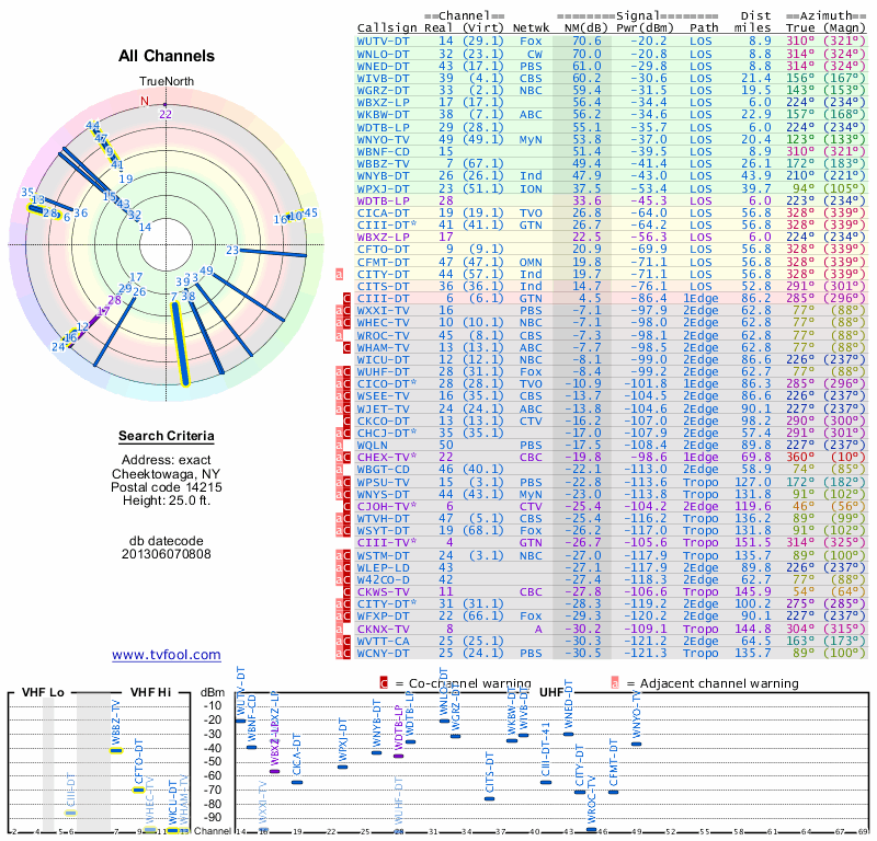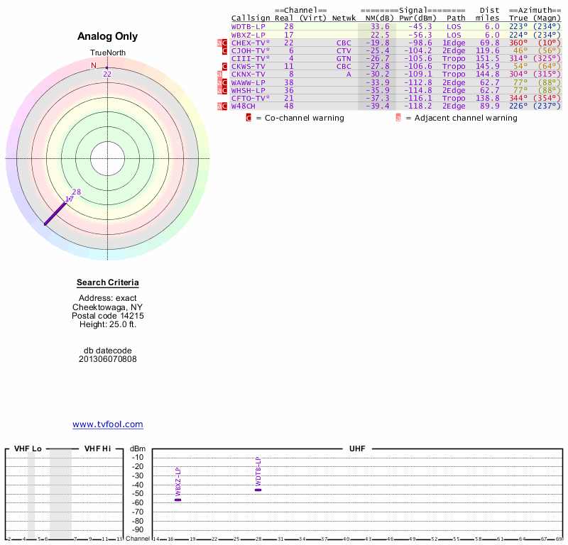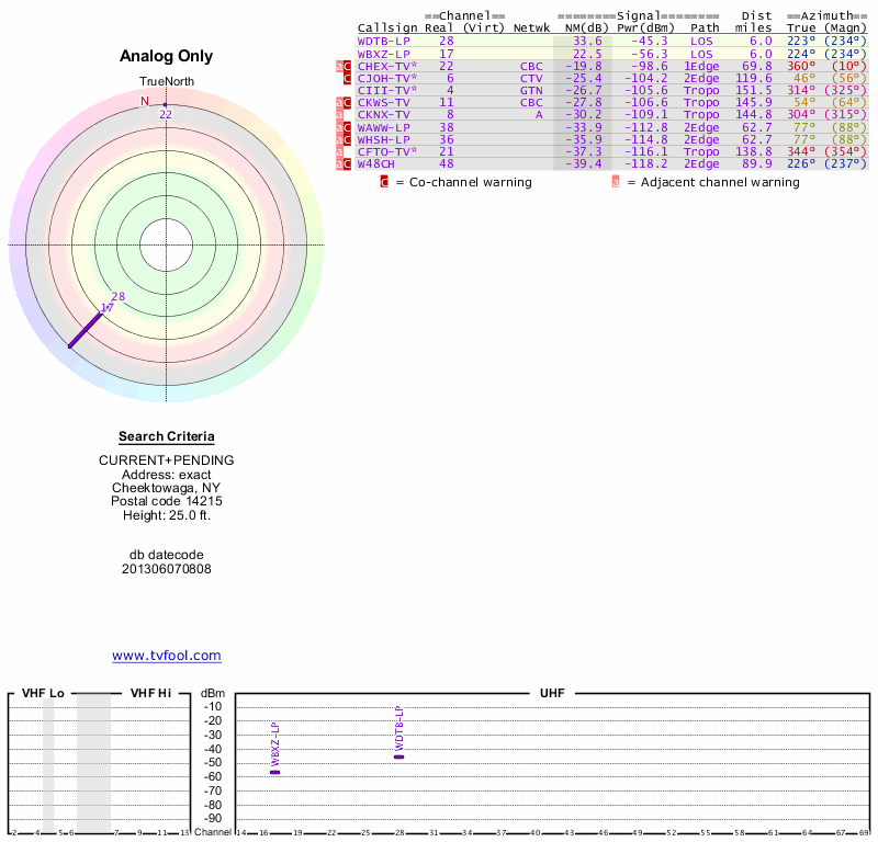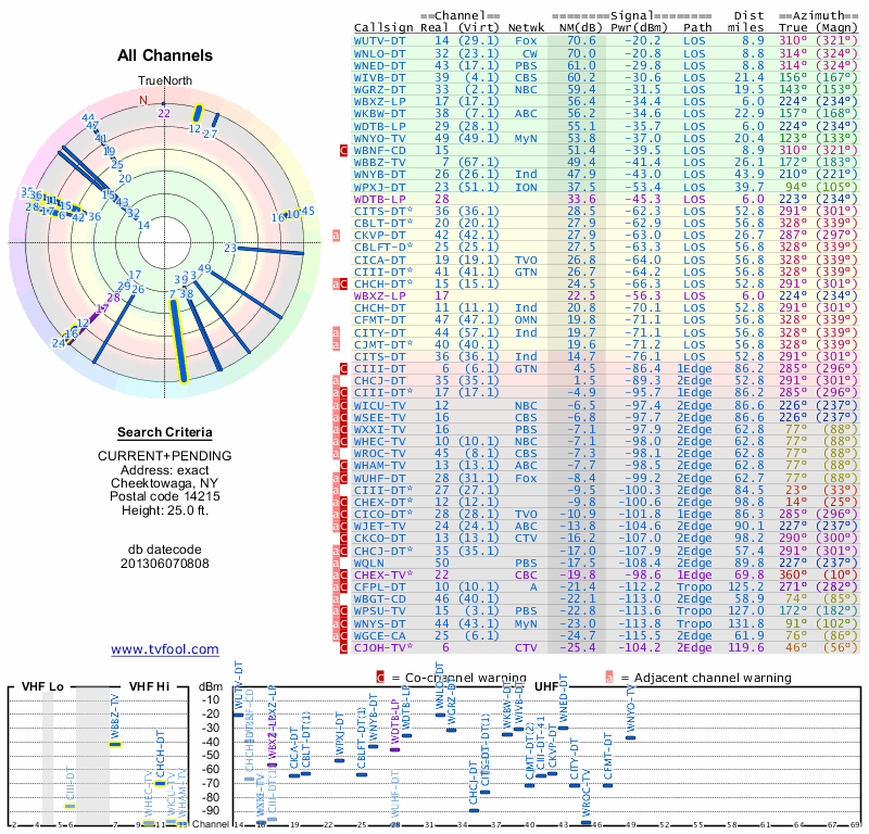 Here are the results for your location. The transmitter database was last updated on June 7, 2013. For more information about these plots and how to interpret them, please check out the Signal Analysis FAQ.
