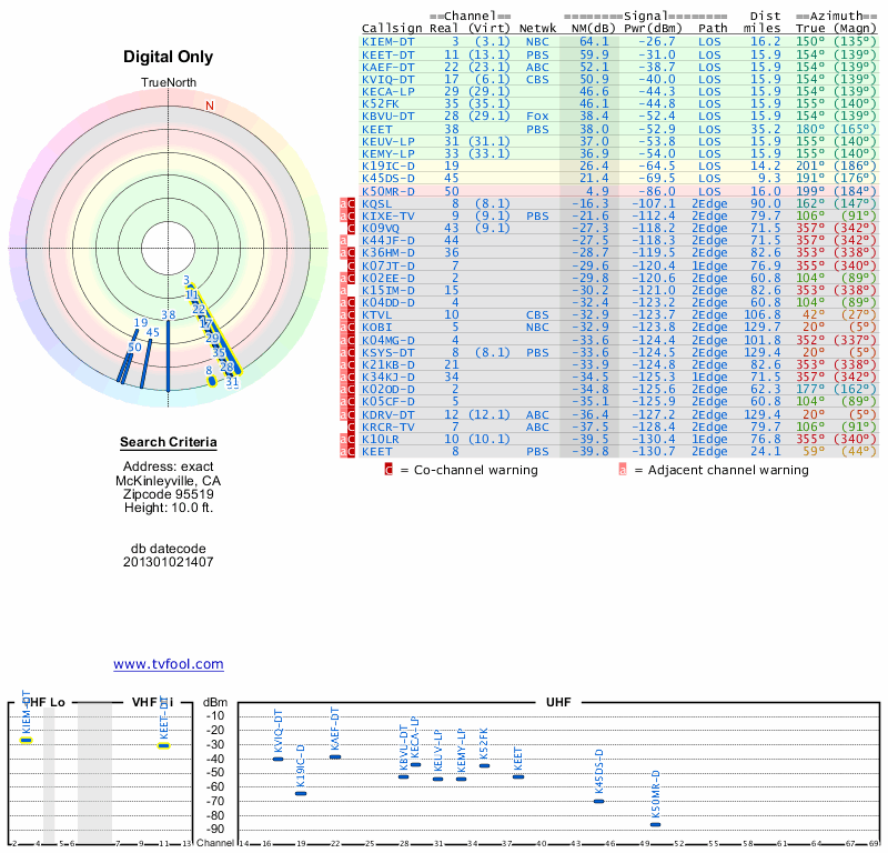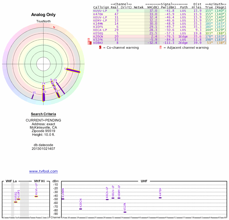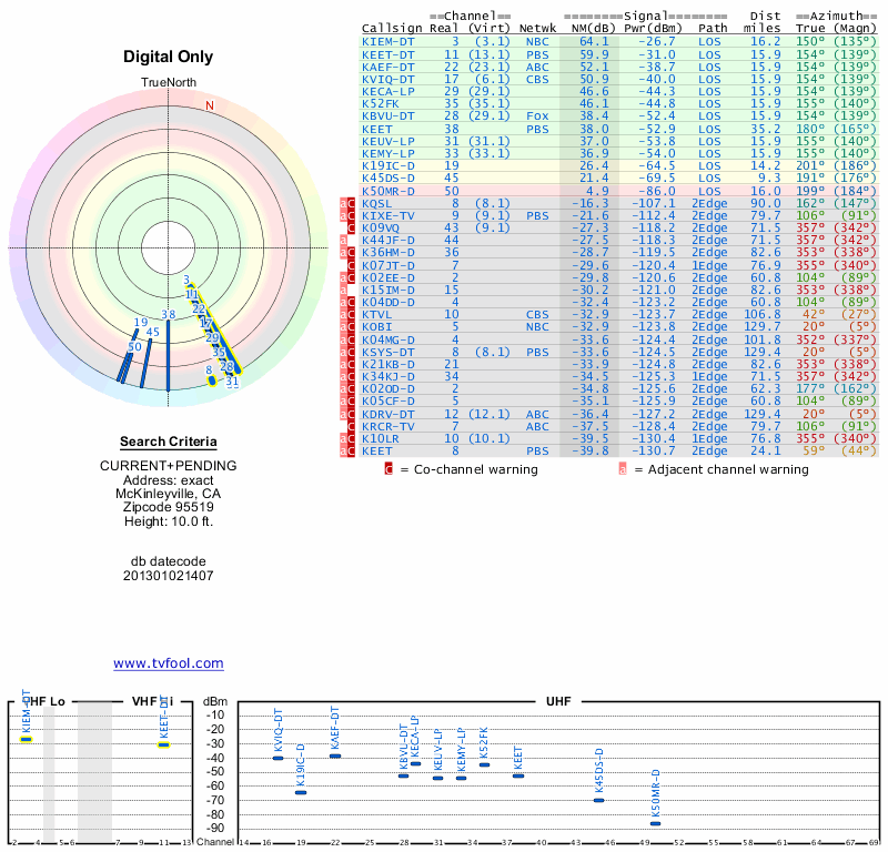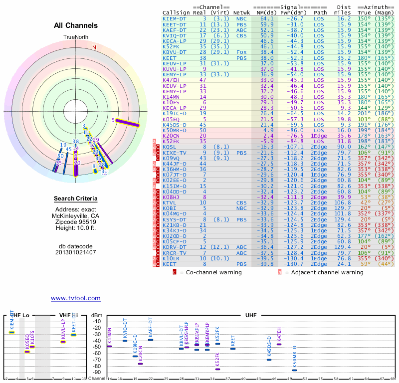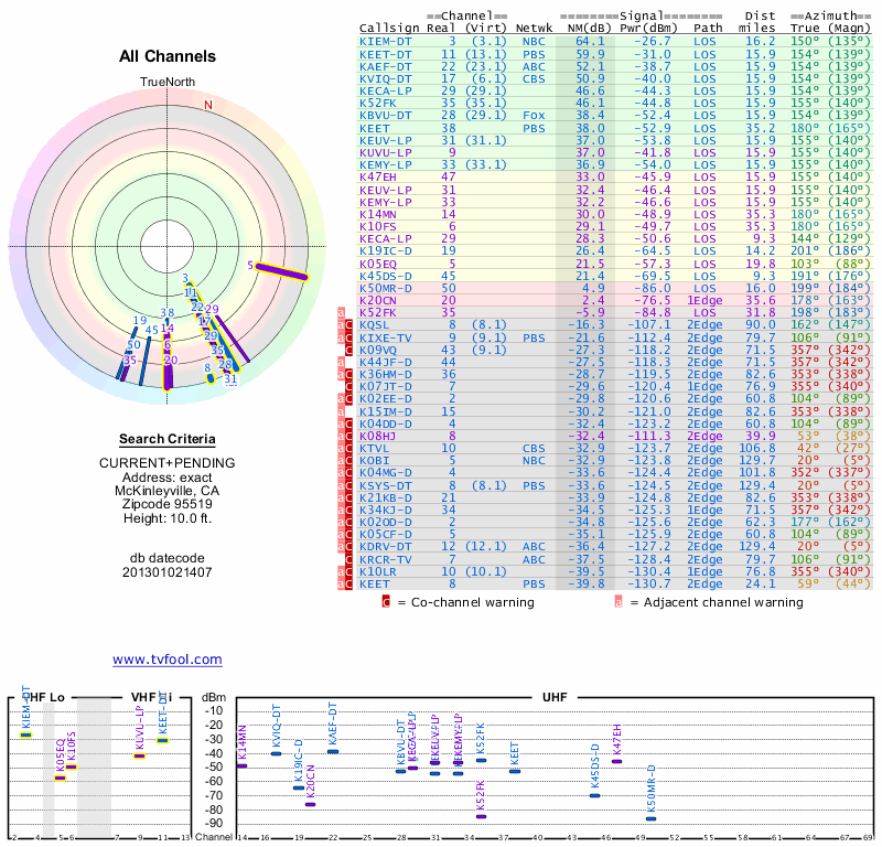 Here are the results for your location. The transmitter database was last updated on June 7, 2013. For more information about these plots and how to interpret them, please check out the Signal Analysis FAQ.