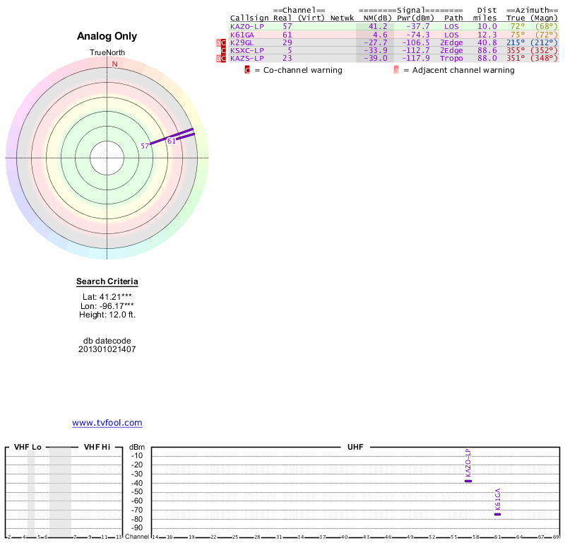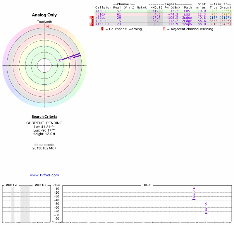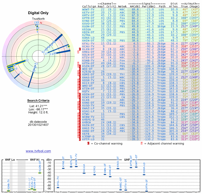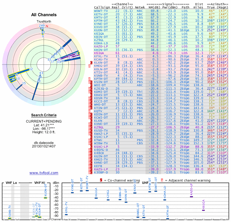 Here are the results for your location. The transmitter database was last updated on June 7, 2013. For more information about these plots and how to interpret them, please check out the Signal Analysis FAQ.