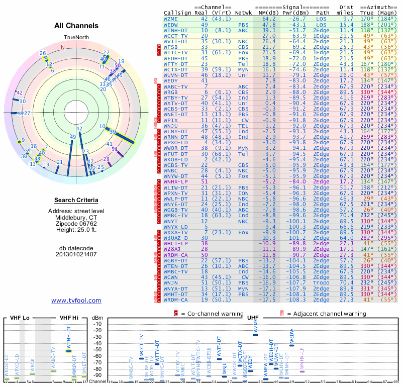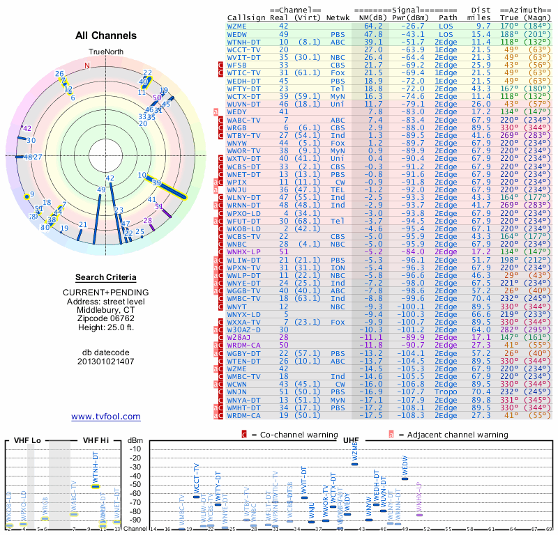 Here are the results for your location. The transmitter database was last updated on June 7, 2013. For more information about these plots and how to interpret them, please check out the Signal Analysis FAQ.