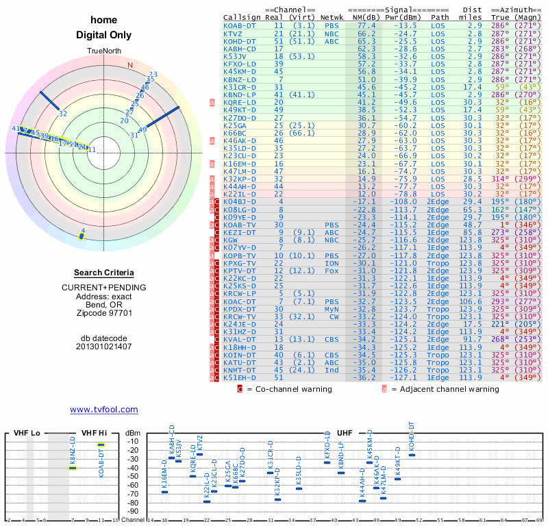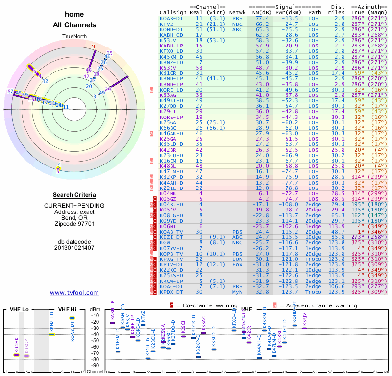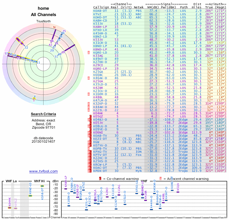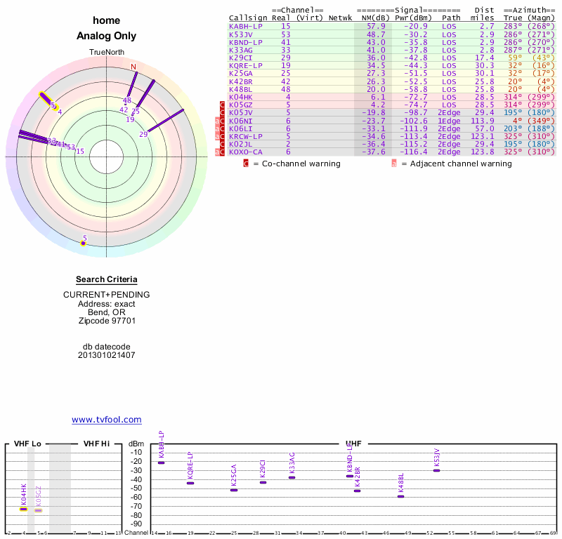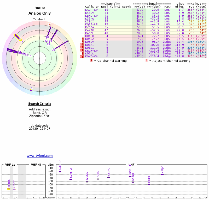 Here are the results for your location. The transmitter database was last updated on June 7, 2013. For more information about these plots and how to interpret them, please check out the Signal Analysis FAQ.
