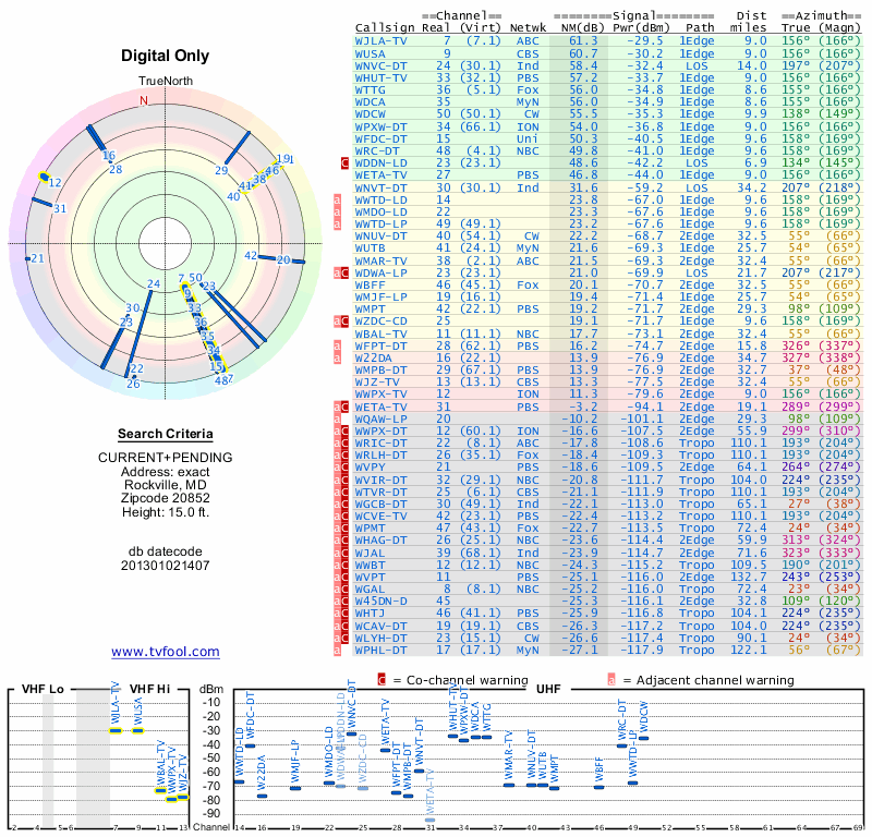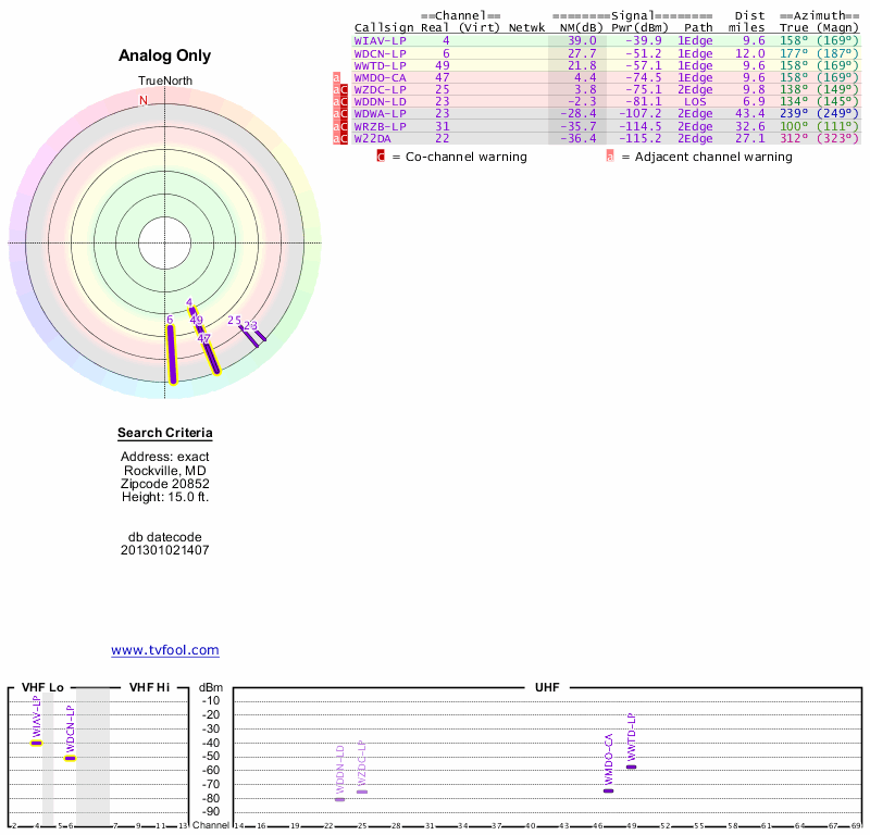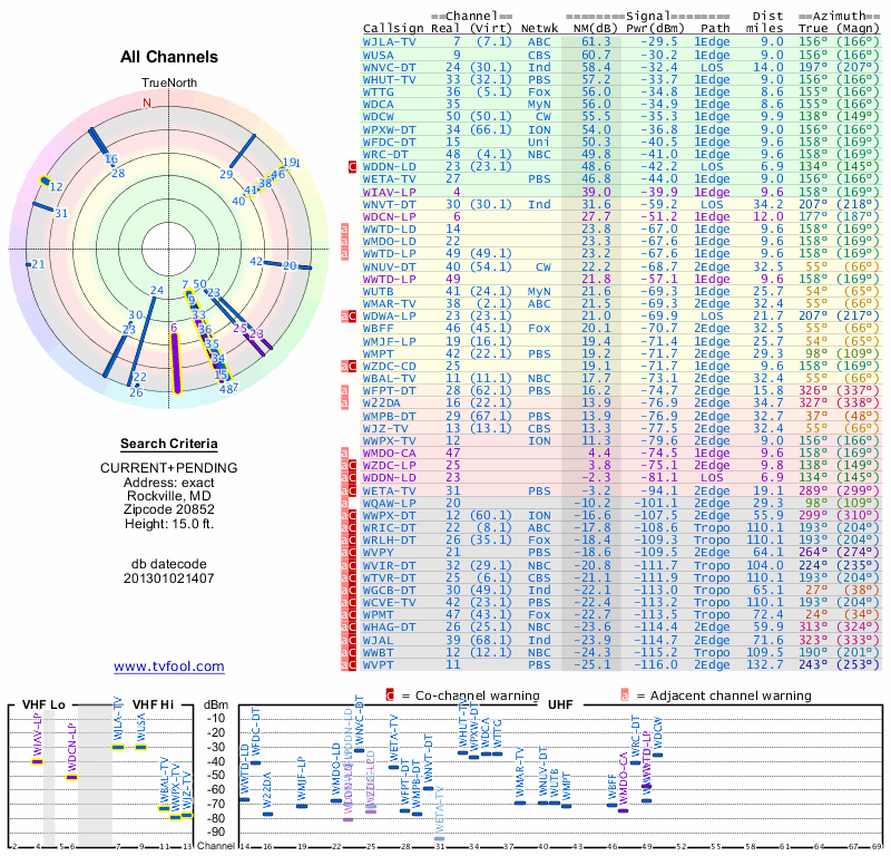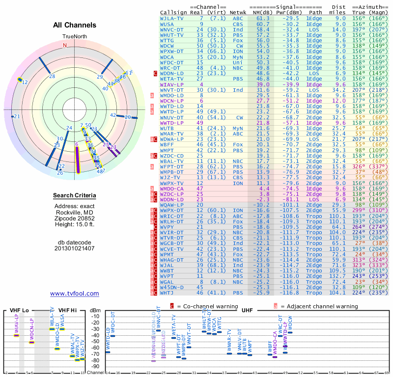 Here are the results for your location. The transmitter database was last updated on June 7, 2013. For more information about these plots and how to interpret them, please check out the Signal Analysis FAQ.