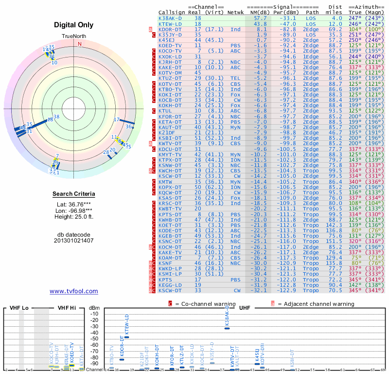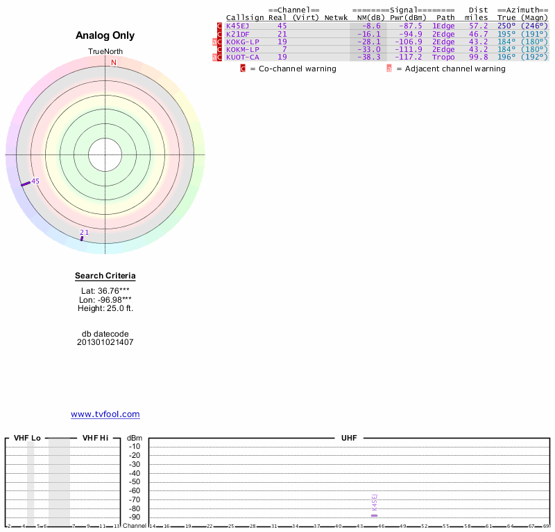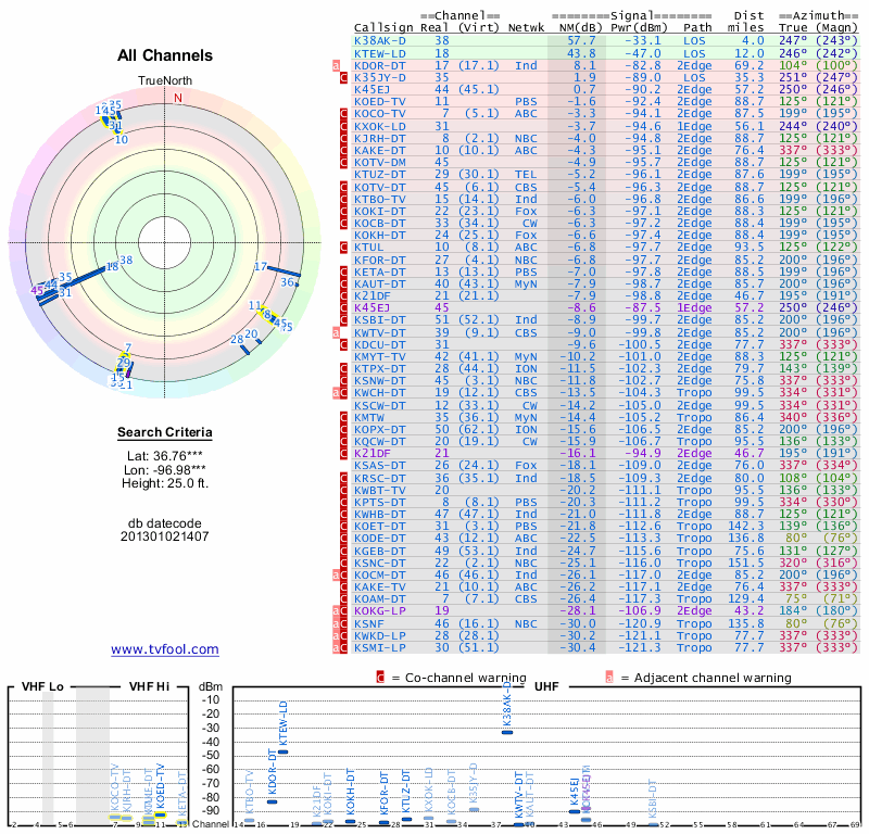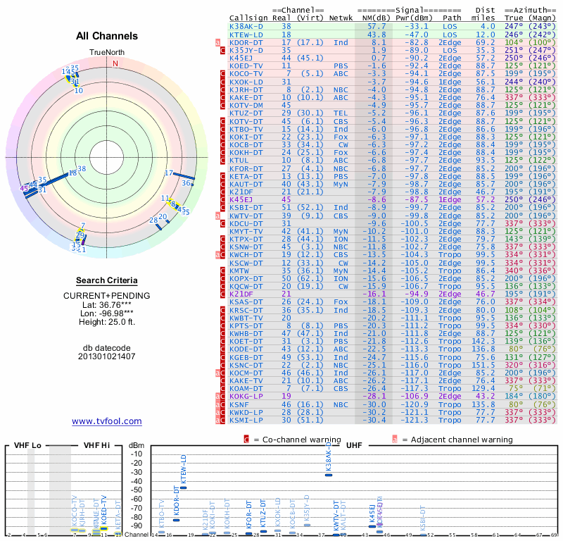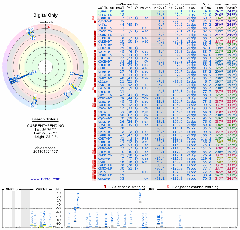 Here are the results for your location. The transmitter database was last updated on June 7, 2013. For more information about these plots and how to interpret them, please check out the Signal Analysis FAQ.