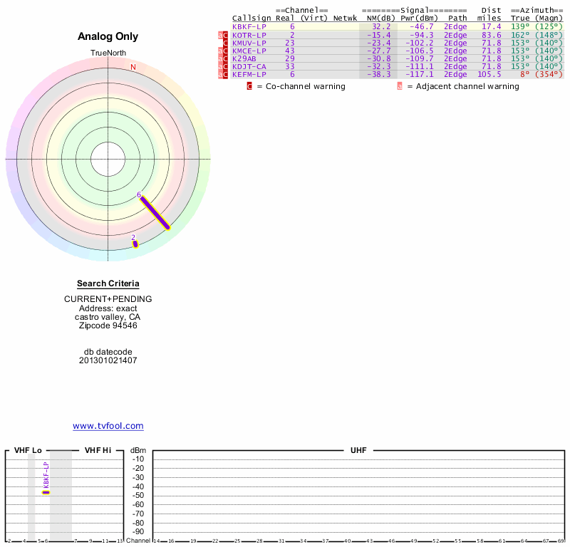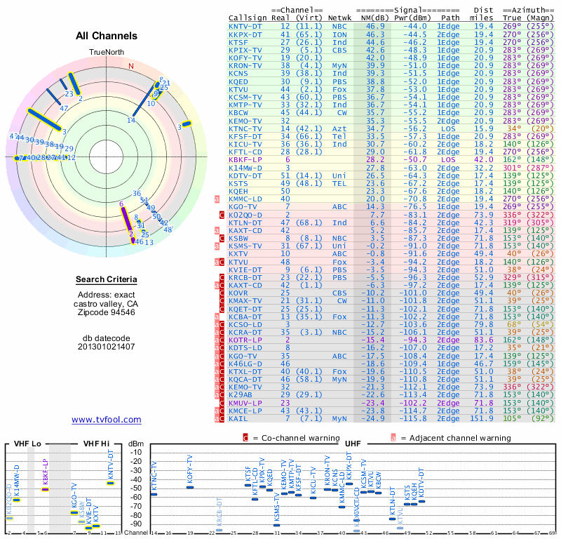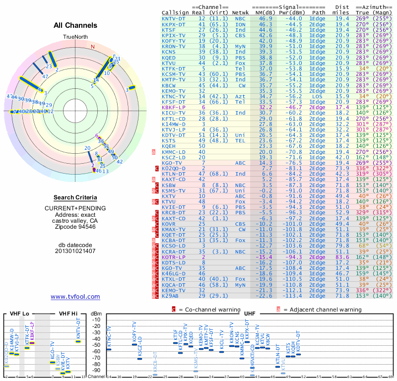 Here are the results for your location. The transmitter database was last updated on June 7, 2013. For more information about these plots and how to interpret them, please check out the Signal Analysis FAQ.