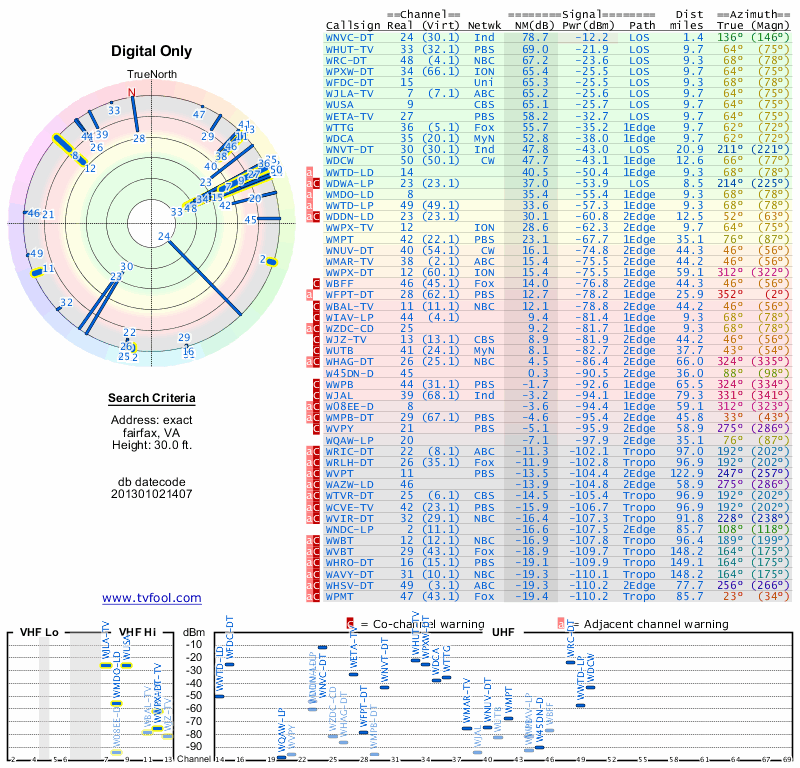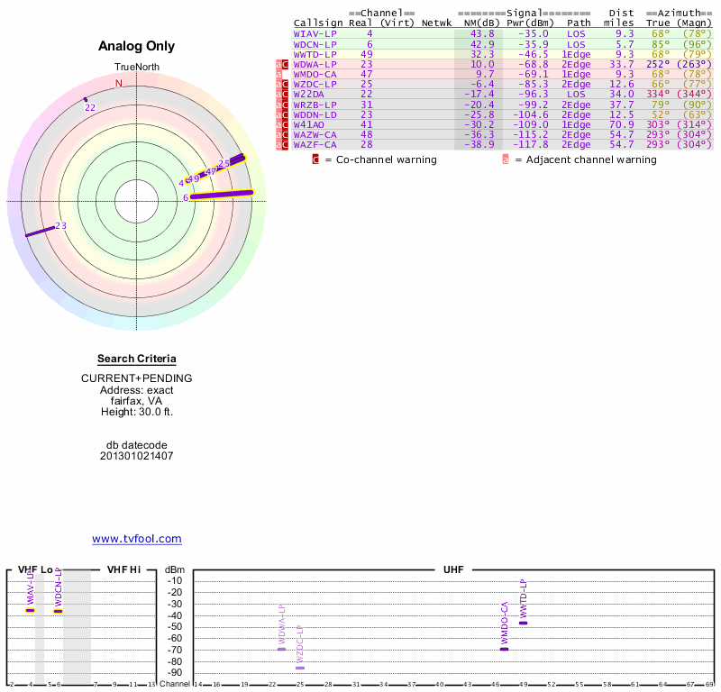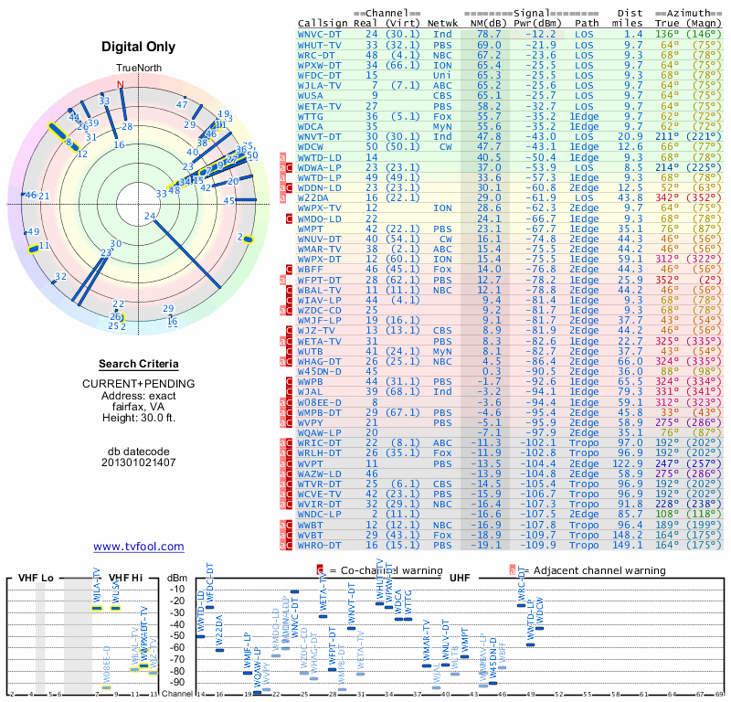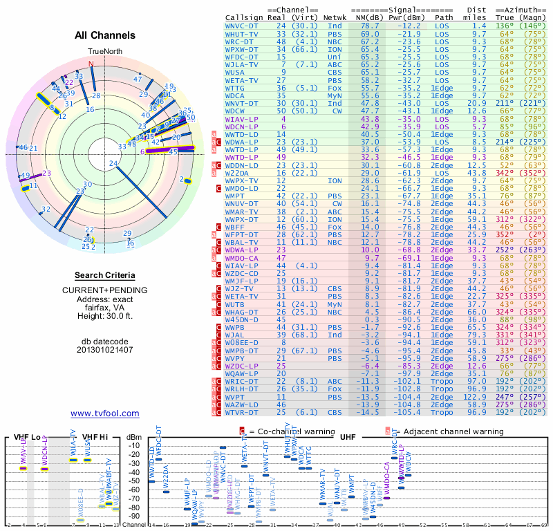 Here are the results for your location. The transmitter database was last updated on June 7, 2013. For more information about these plots and how to interpret them, please check out the Signal Analysis FAQ.
