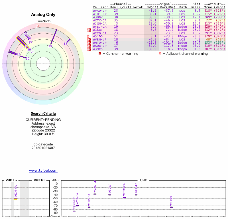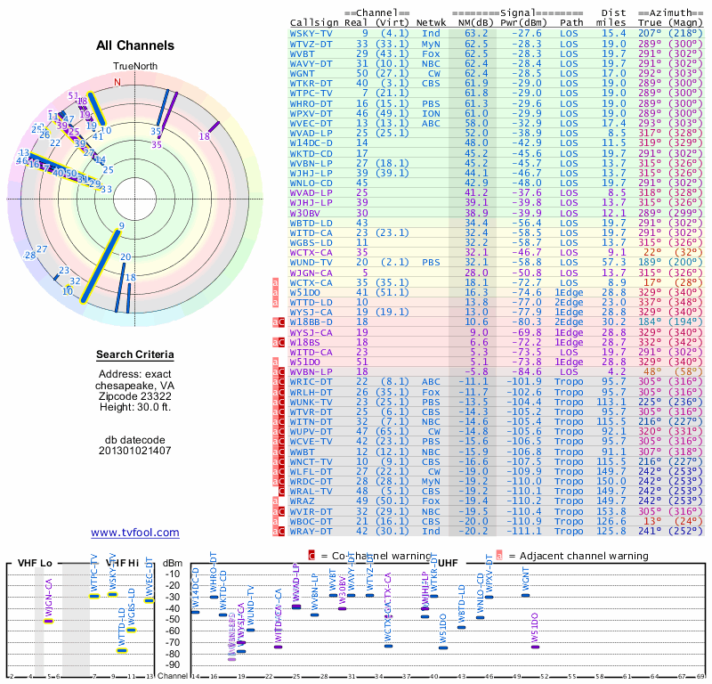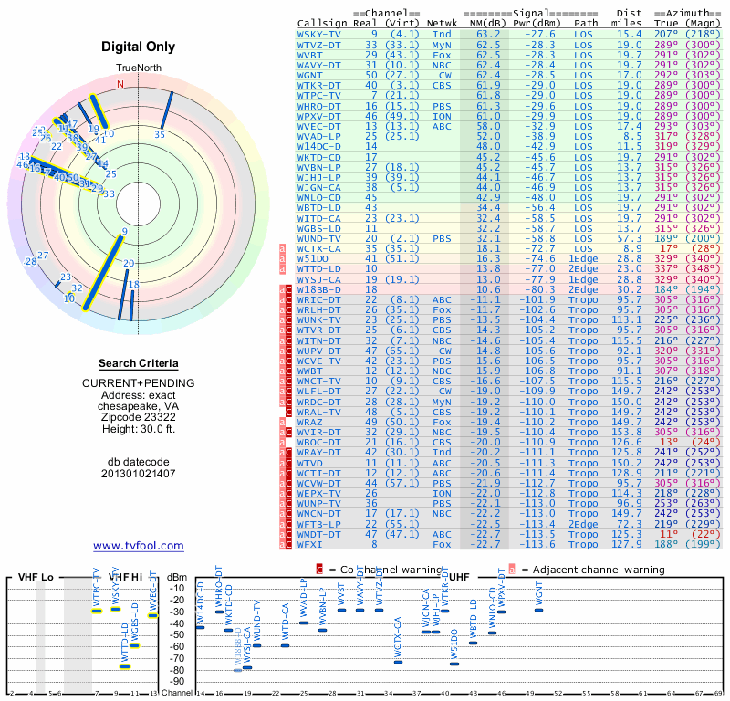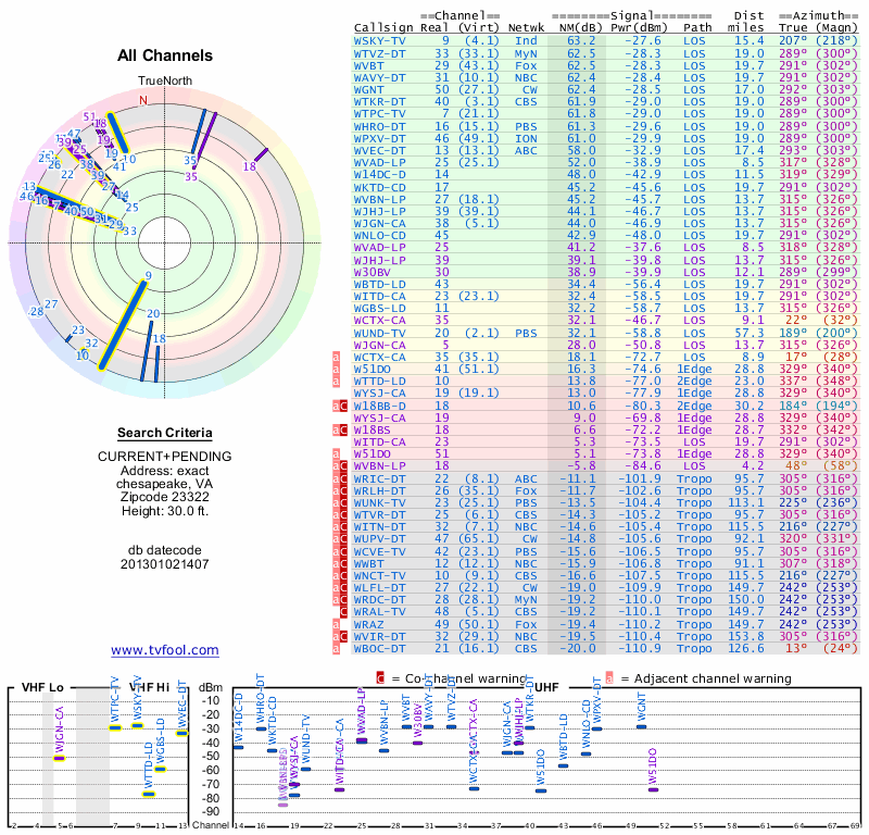 Here are the results for your location. The transmitter database was last updated on June 7, 2013. For more information about these plots and how to interpret them, please check out the Signal Analysis FAQ.