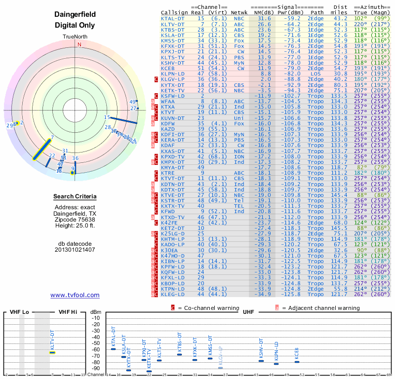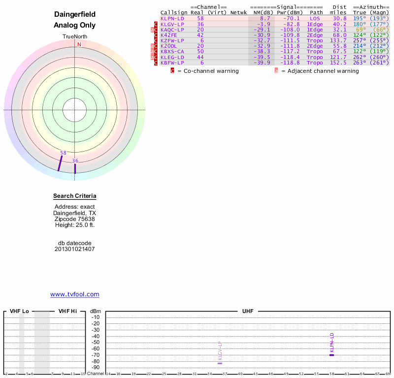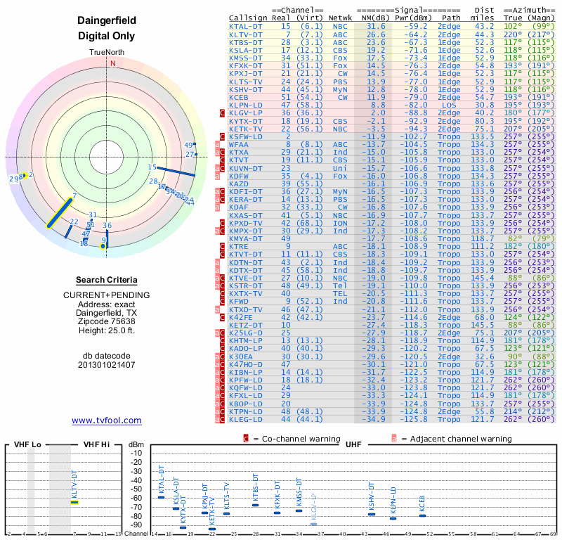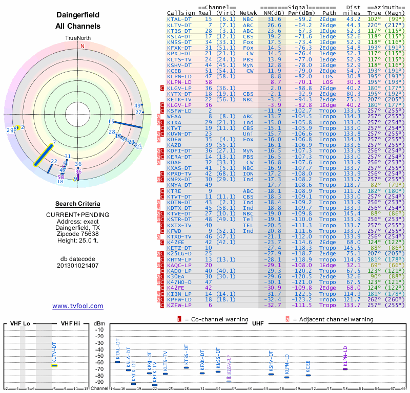 Here are the results for your location. The transmitter database was last updated on June 7, 2013. For more information about these plots and how to interpret them, please check out the Signal Analysis FAQ.