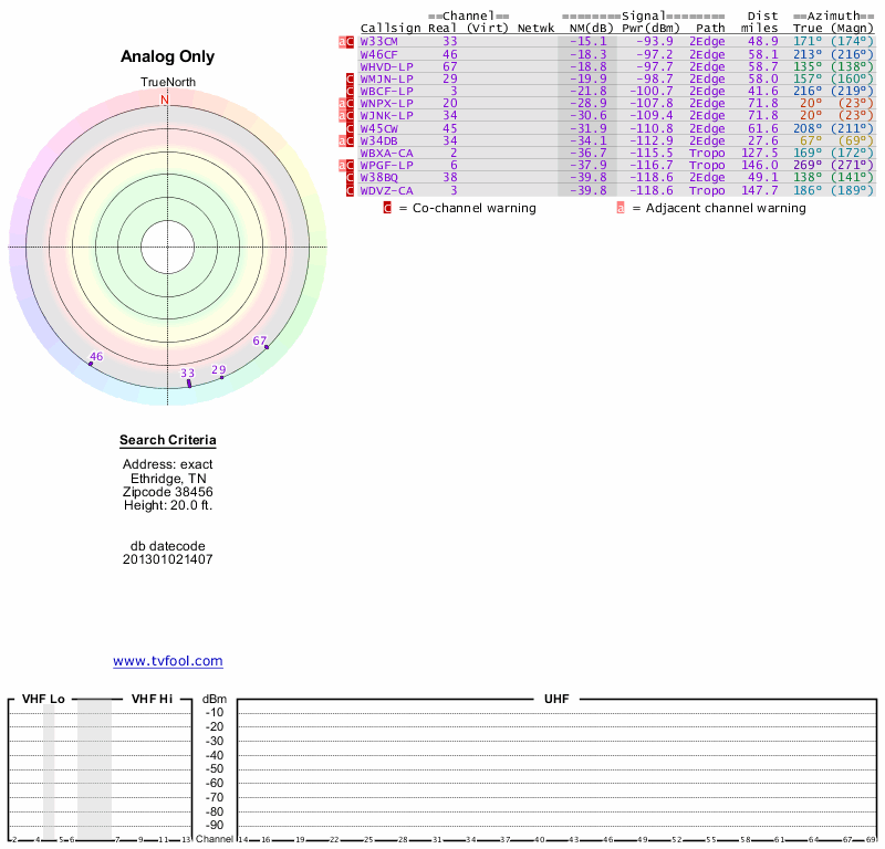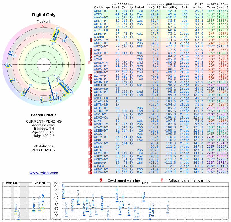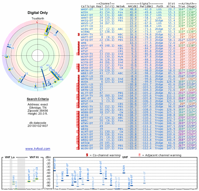 Here are the results for your location. The transmitter database was last updated on June 7, 2013. For more information about these plots and how to interpret them, please check out the Signal Analysis FAQ.