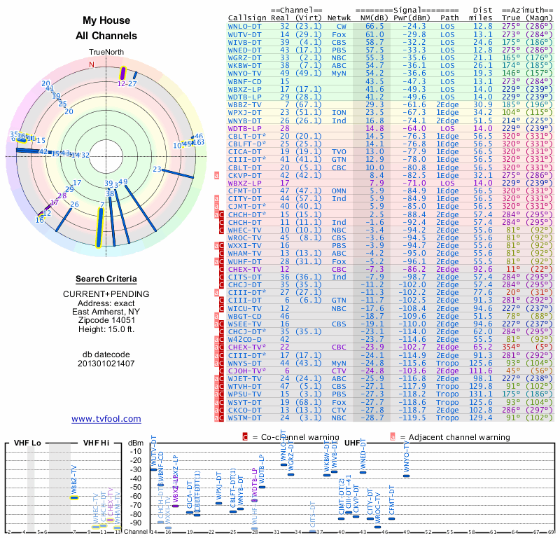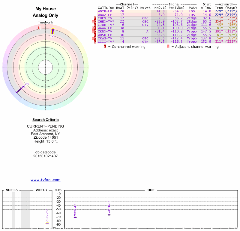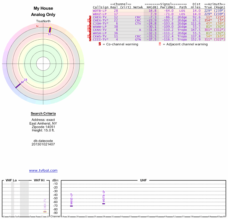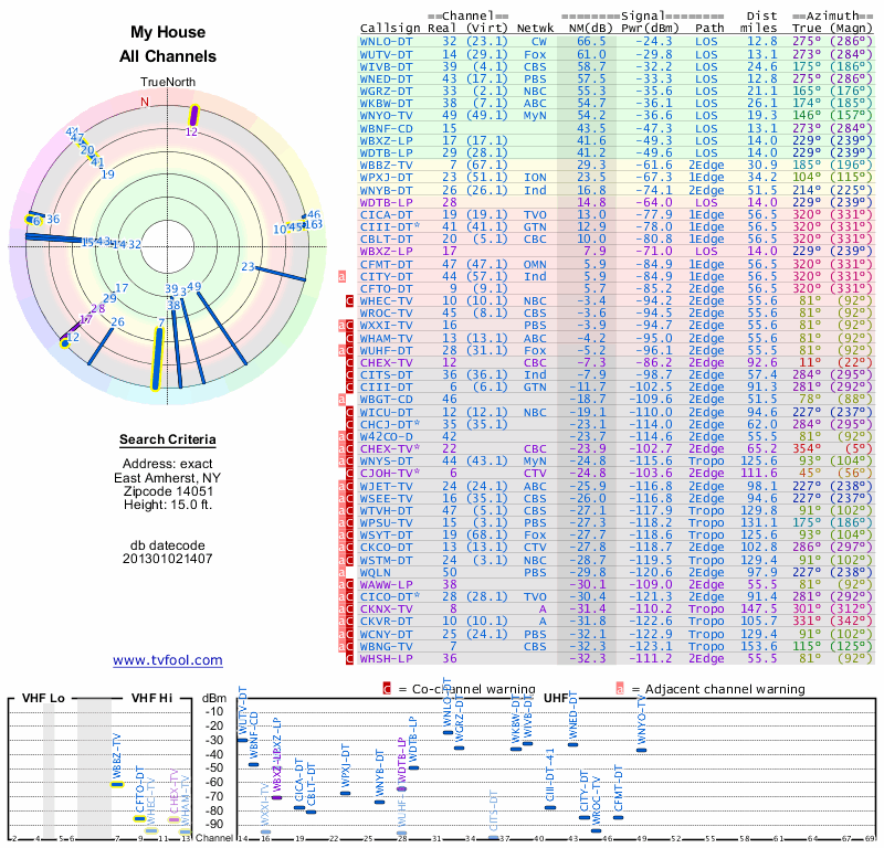 Here are the results for your location. The transmitter database was last updated on June 7, 2013. For more information about these plots and how to interpret them, please check out the Signal Analysis FAQ.