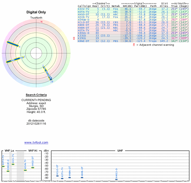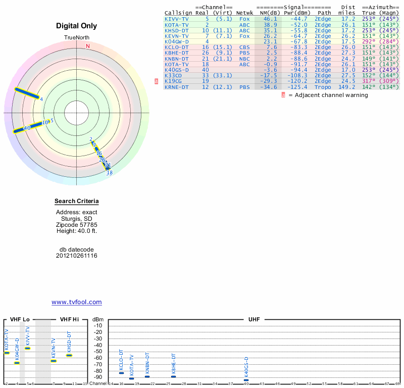Here are the results for your location. The transmitter database was last updated on June 7, 2013. For more information about these plots and how to interpret them, please check out the Signal Analysis FAQ.