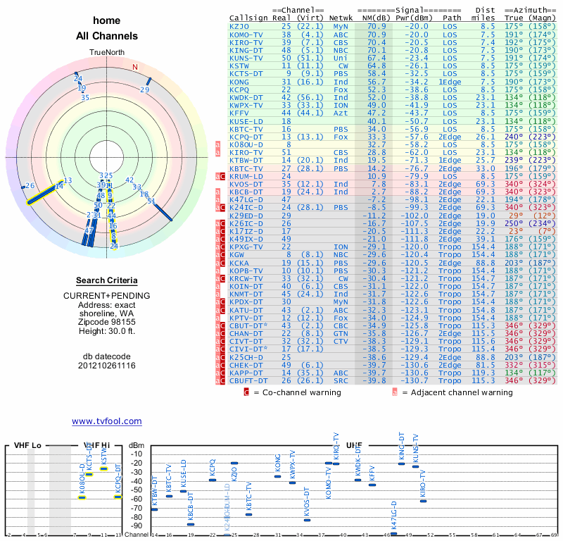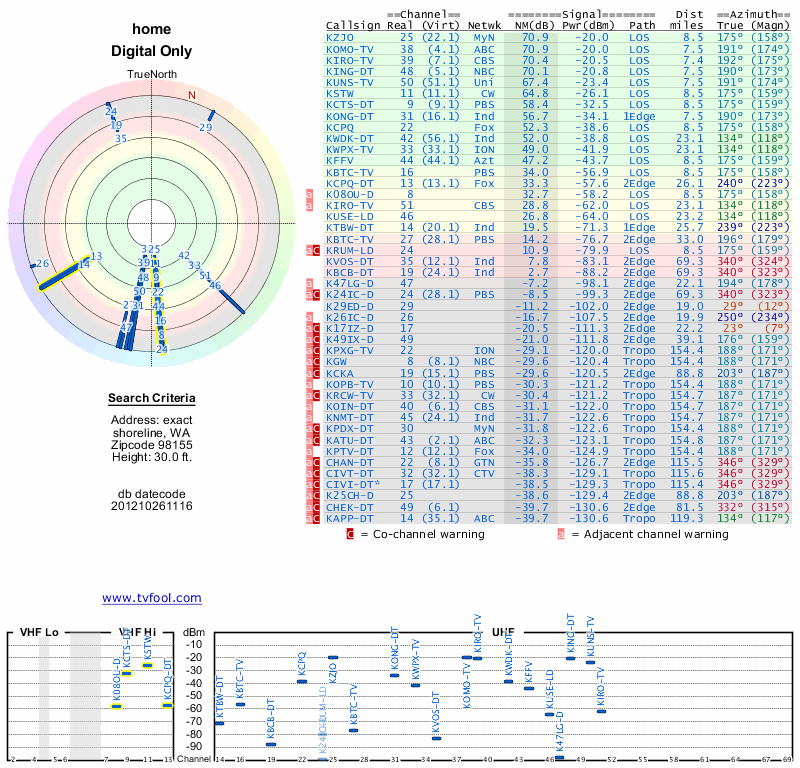 Here are the results for your location. The transmitter database was last updated on June 7, 2013. For more information about these plots and how to interpret them, please check out the Signal Analysis FAQ.
