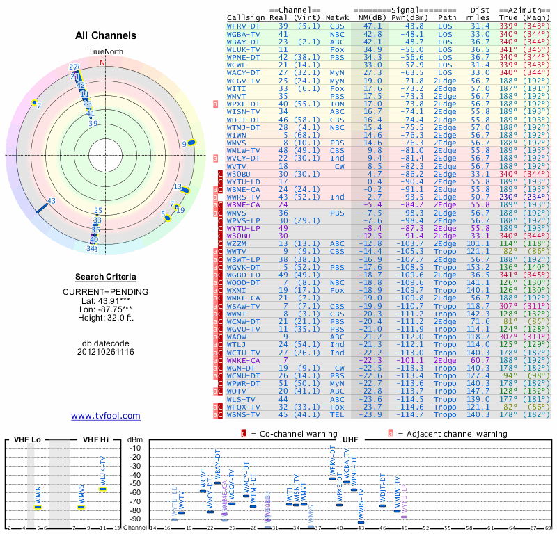 Here are the results for your location. The transmitter database was last updated on June 7, 2013. For more information about these plots and how to interpret them, please check out the Signal Analysis FAQ.