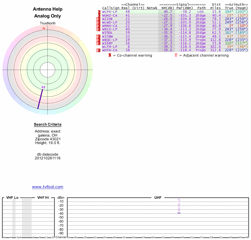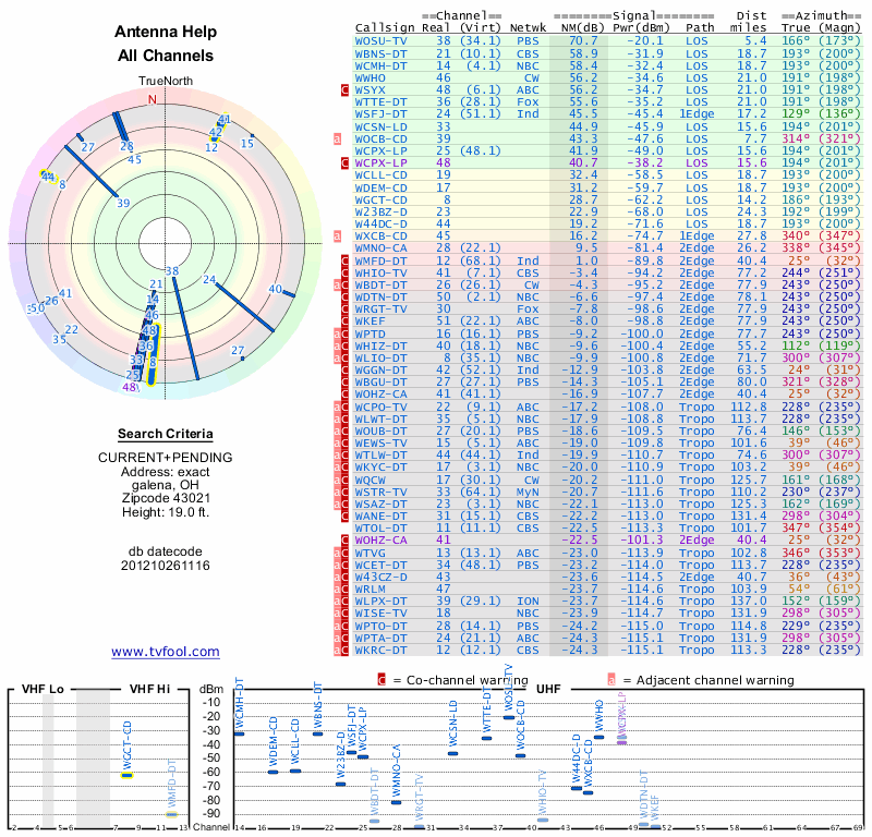 Here are the results for your location. The transmitter database was last updated on June 7, 2013. For more information about these plots and how to interpret them, please check out the Signal Analysis FAQ.