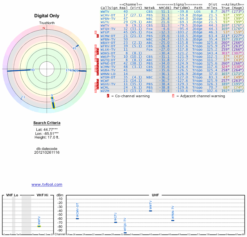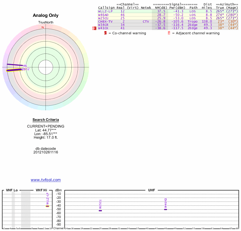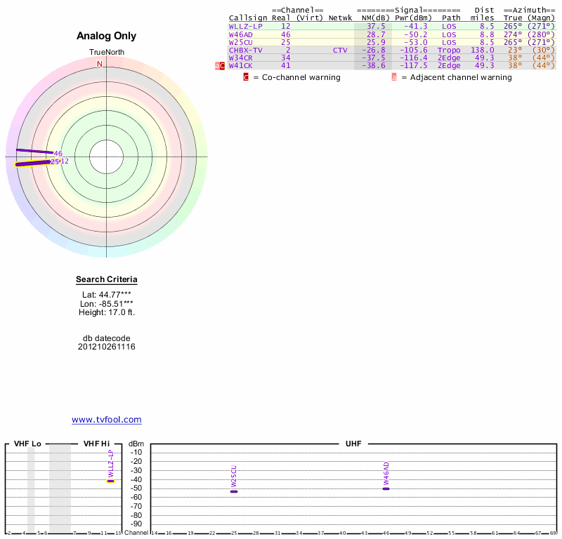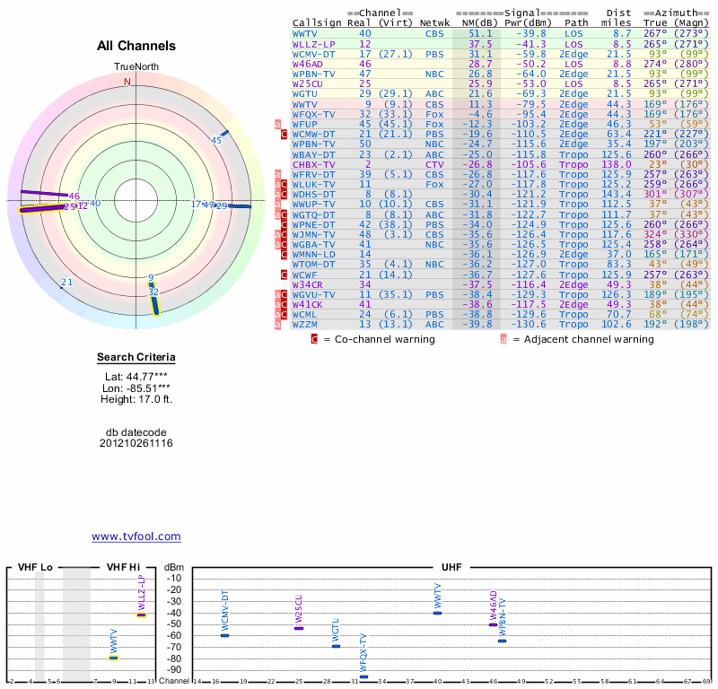 Here are the results for your location. The transmitter database was last updated on June 7, 2013. For more information about these plots and how to interpret them, please check out the Signal Analysis FAQ.