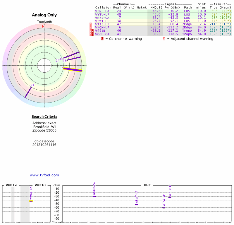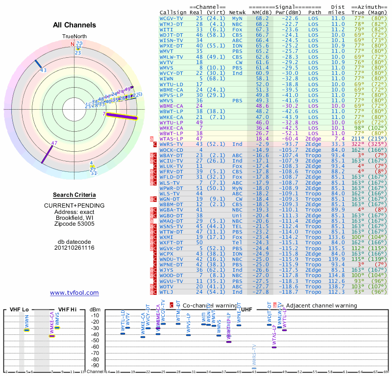 Here are the results for your location. The transmitter database was last updated on June 7, 2013. For more information about these plots and how to interpret them, please check out the Signal Analysis FAQ.