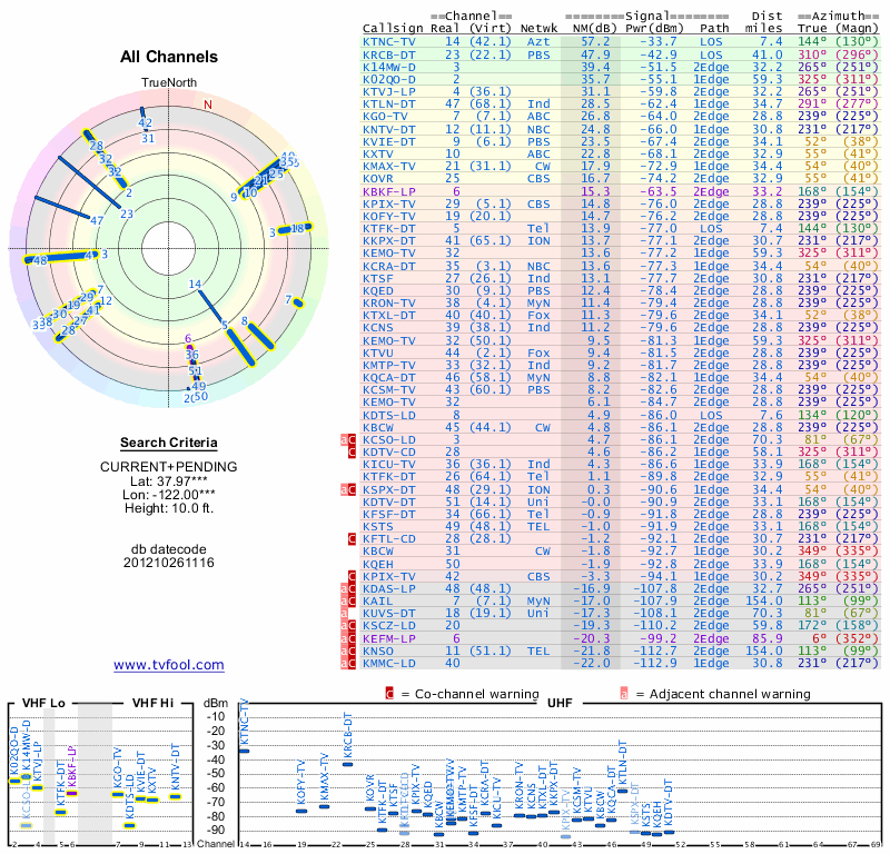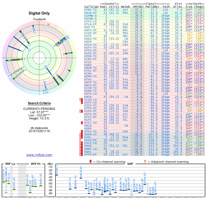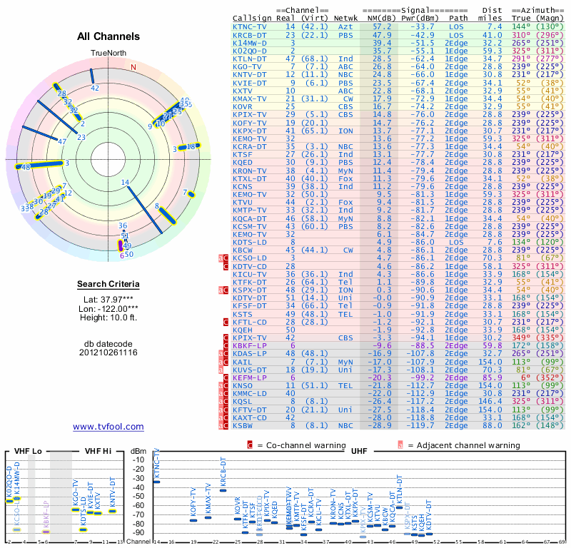 Here are the results for your location. The transmitter database was last updated on June 7, 2013. For more information about these plots and how to interpret them, please check out the Signal Analysis FAQ.