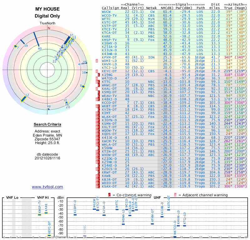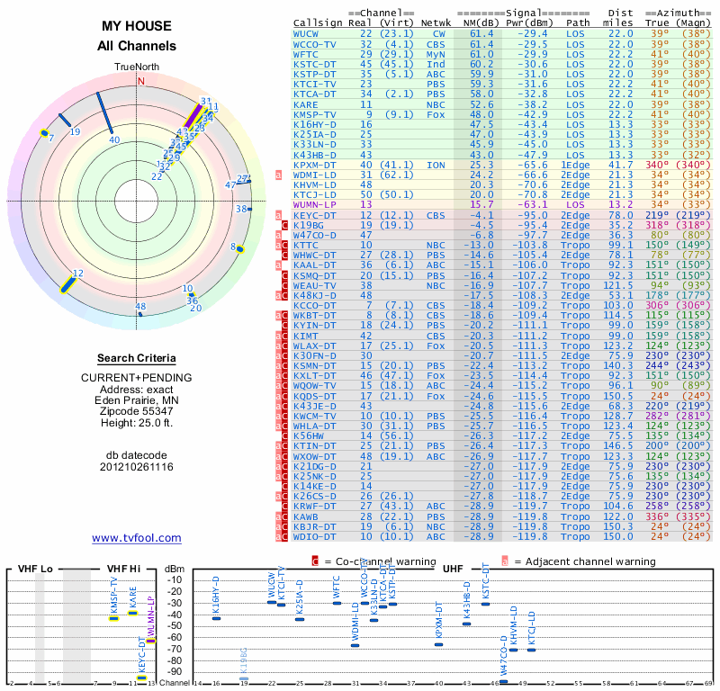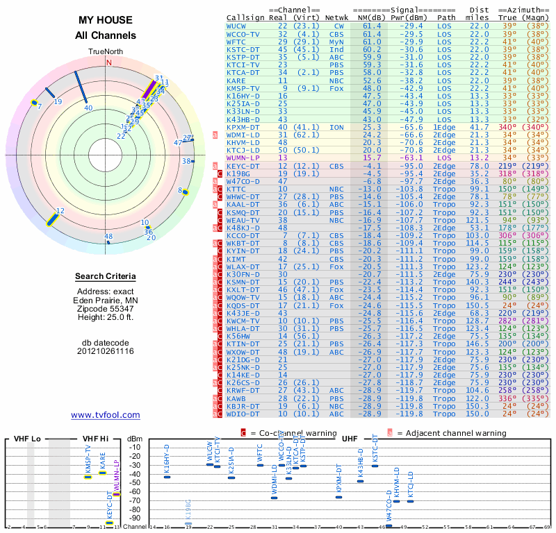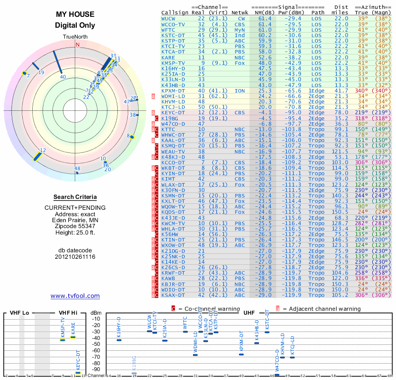 Here are the results for your location. The transmitter database was last updated on June 7, 2013. For more information about these plots and how to interpret them, please check out the Signal Analysis FAQ.