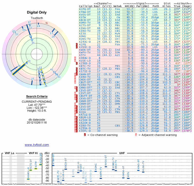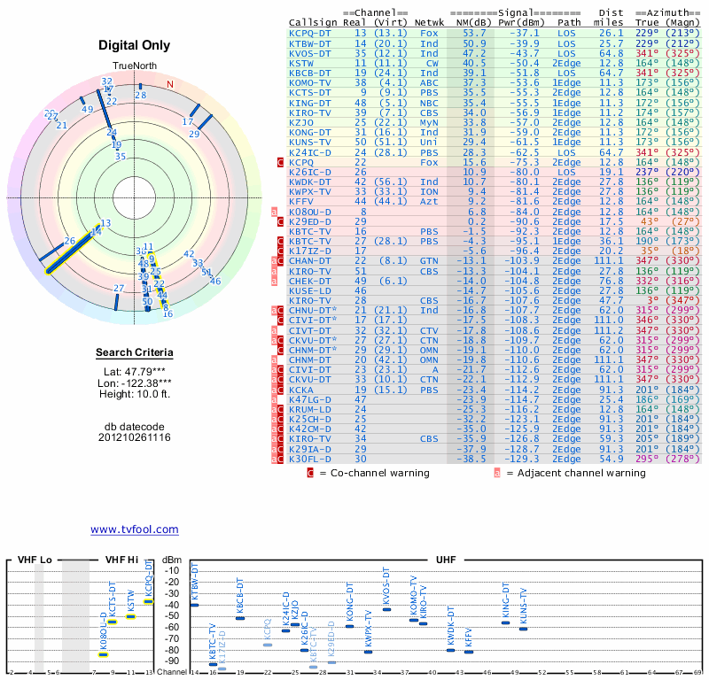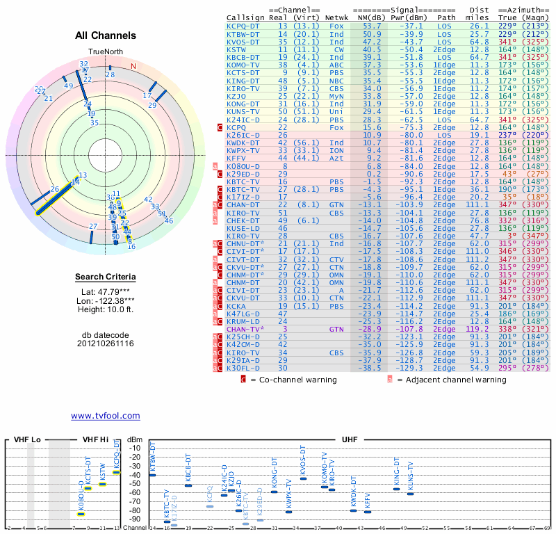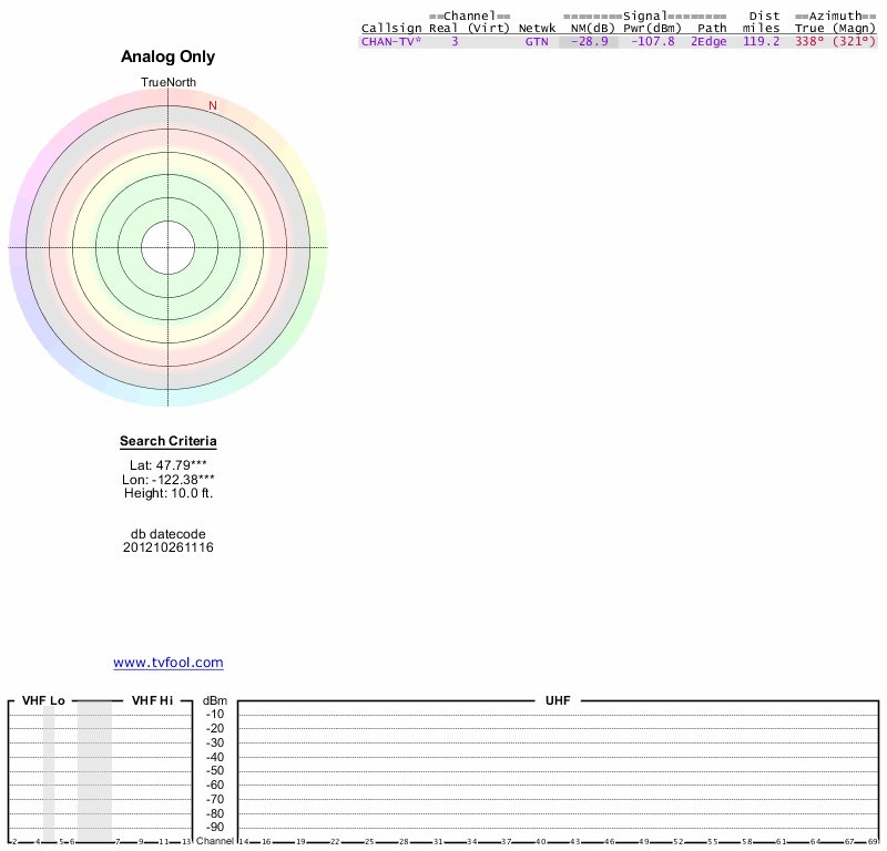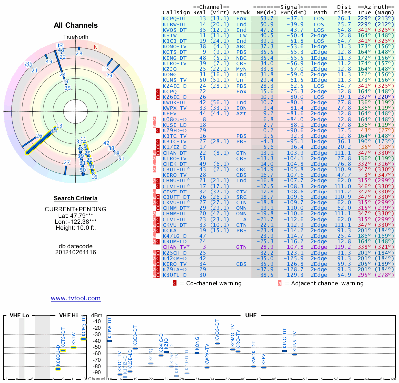 Here are the results for your location. The transmitter database was last updated on June 7, 2013. For more information about these plots and how to interpret them, please check out the Signal Analysis FAQ.