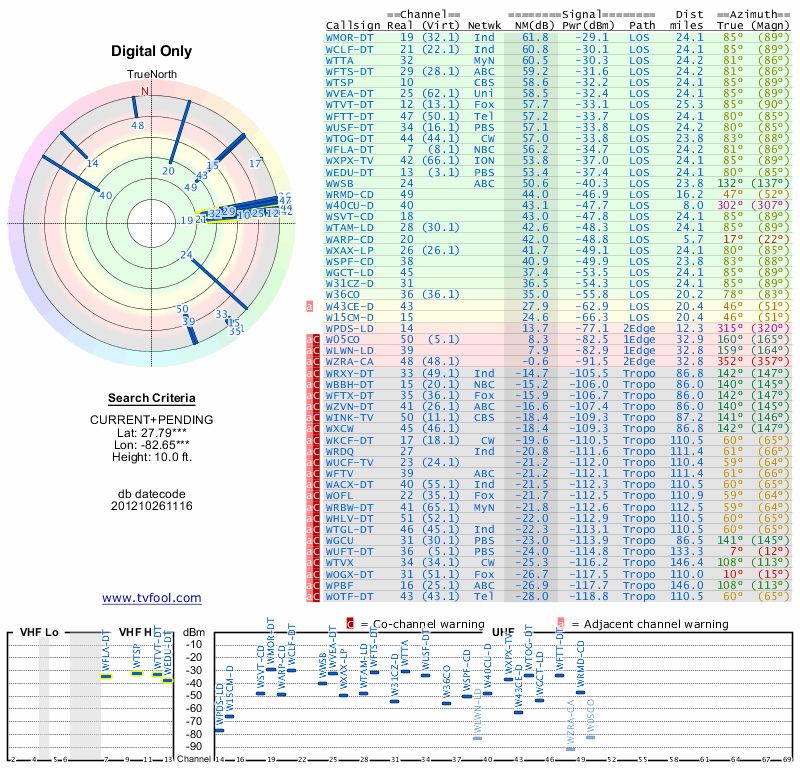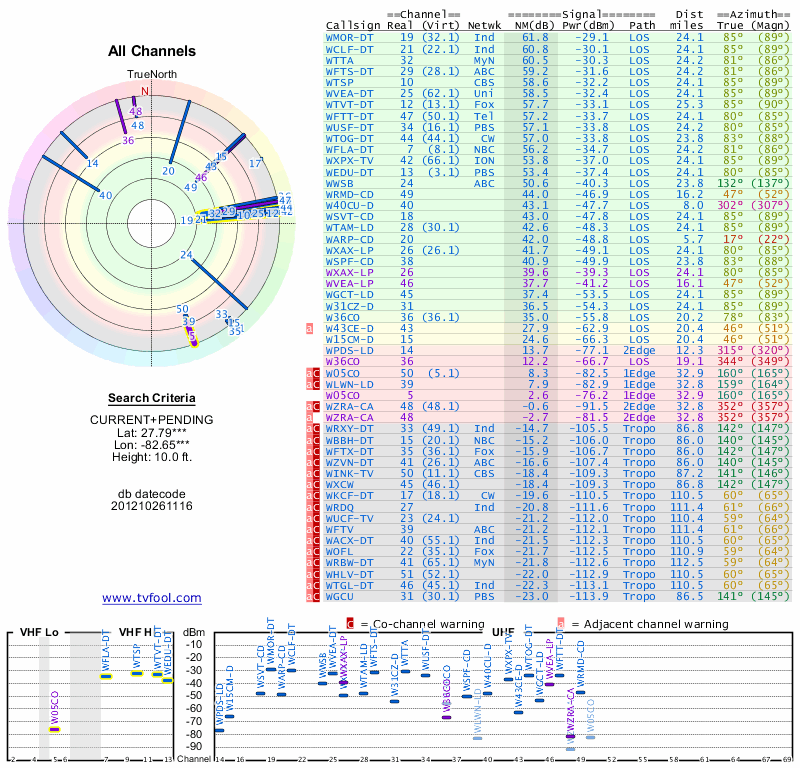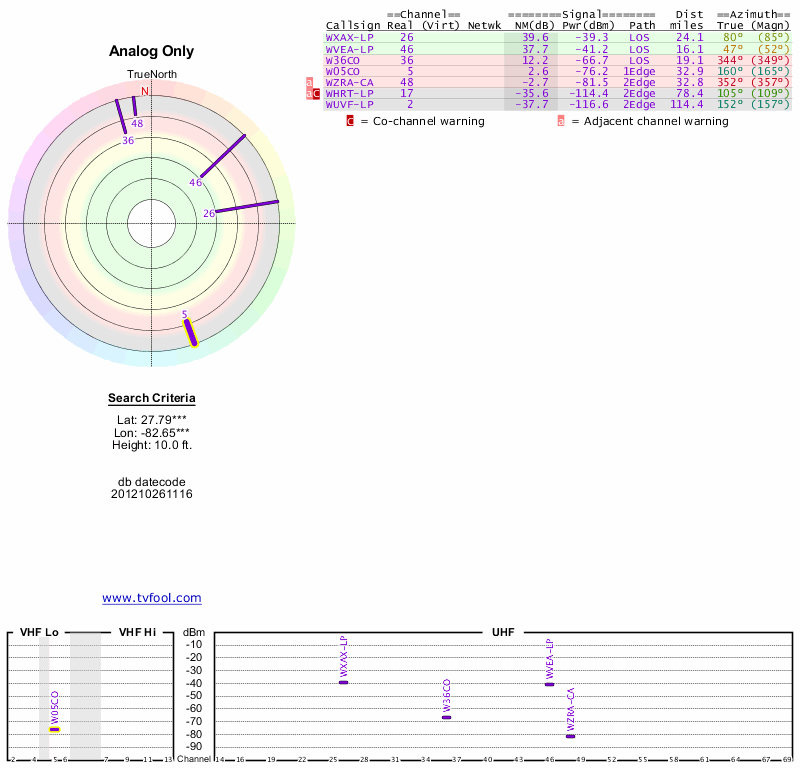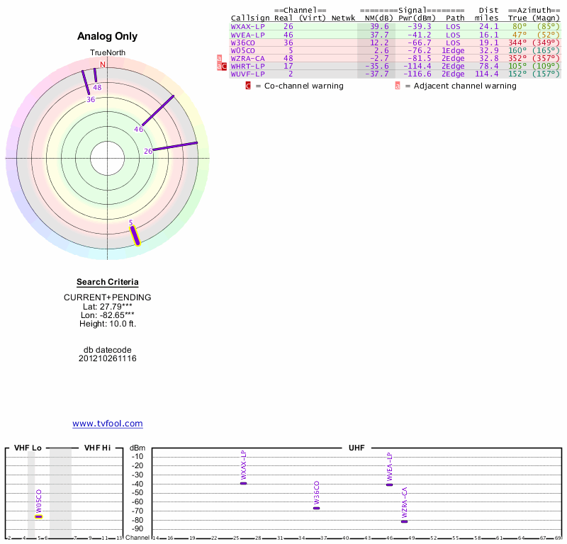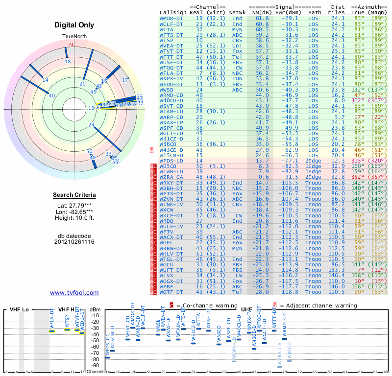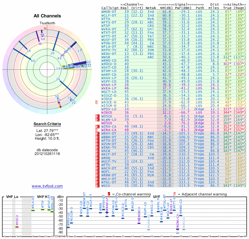 Here are the results for your location. The transmitter database was last updated on June 7, 2013. For more information about these plots and how to interpret them, please check out the Signal Analysis FAQ.
