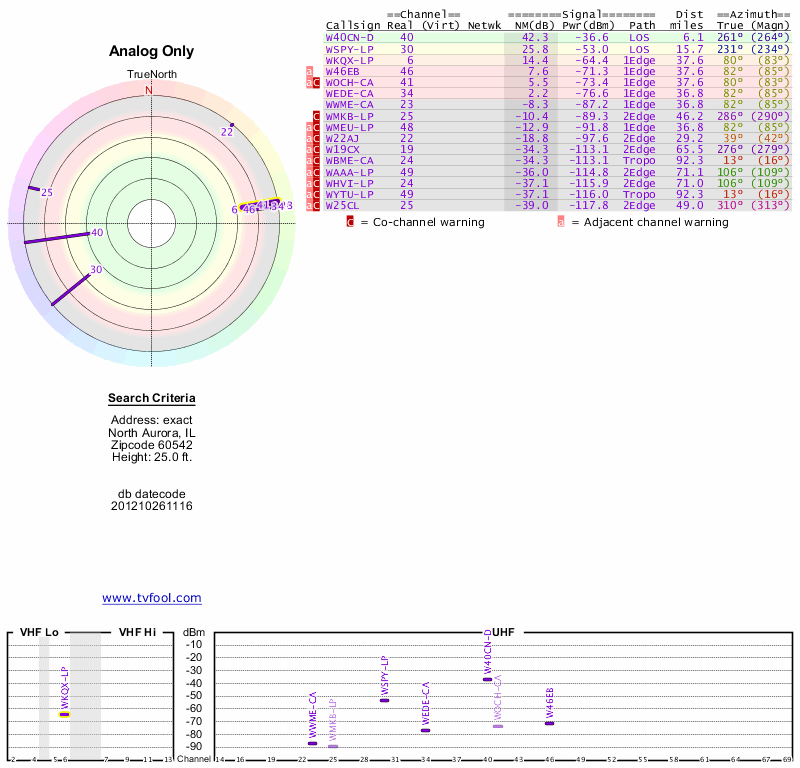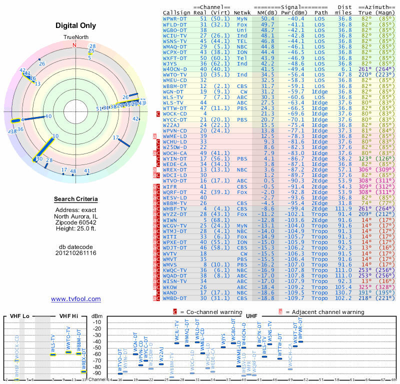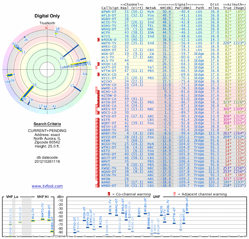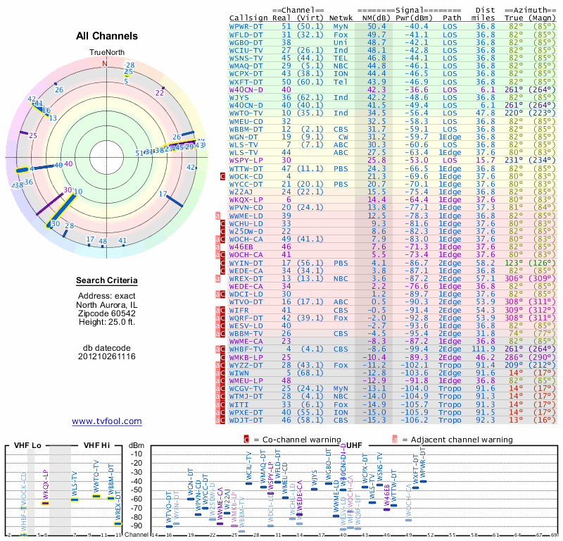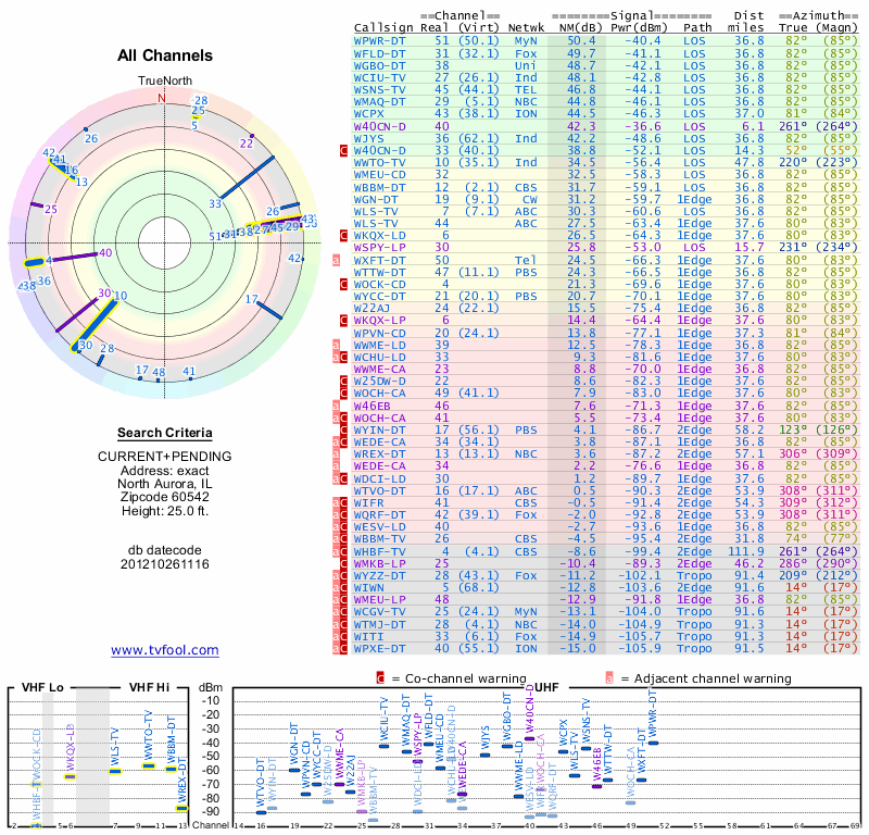 Here are the results for your location. The transmitter database was last updated on June 7, 2013. For more information about these plots and how to interpret them, please check out the Signal Analysis FAQ.