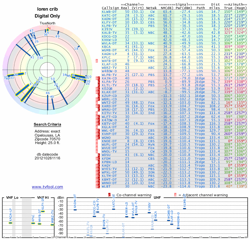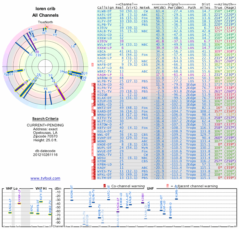 Here are the results for your location. The transmitter database was last updated on June 7, 2013. For more information about these plots and how to interpret them, please check out the Signal Analysis FAQ.