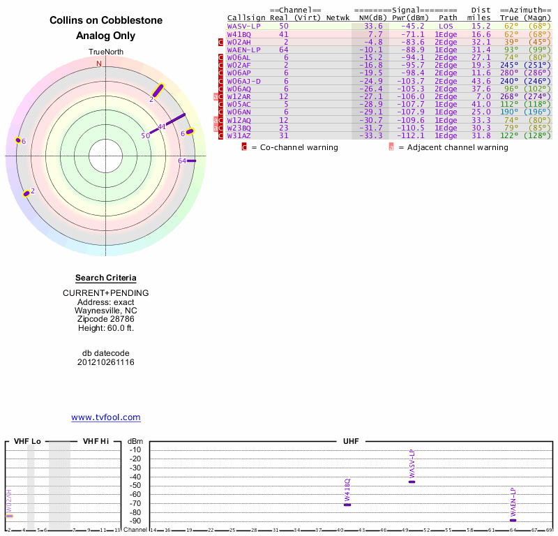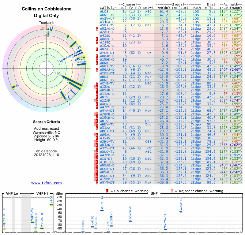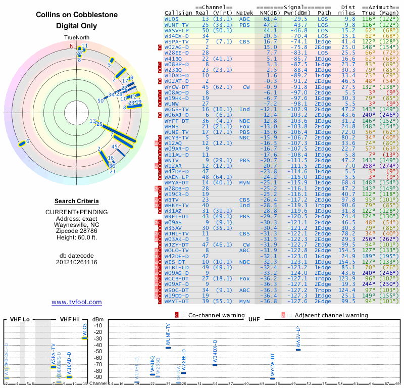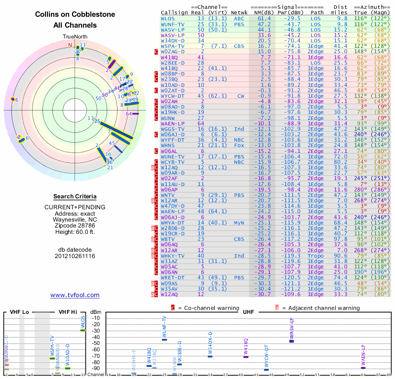 Here are the results for your location. The transmitter database was last updated on June 7, 2013. For more information about these plots and how to interpret them, please check out the Signal Analysis FAQ.