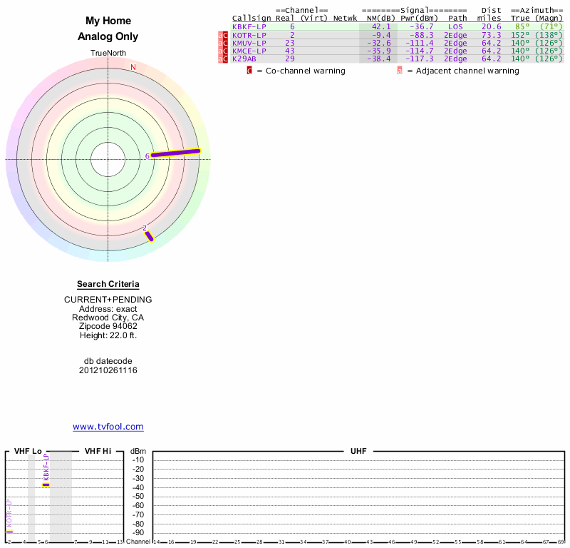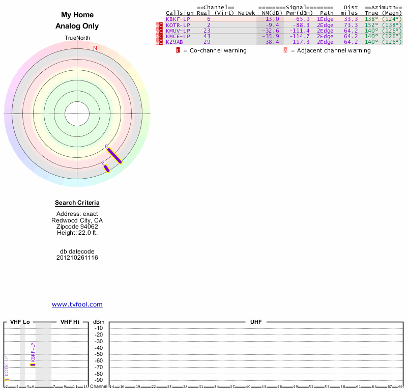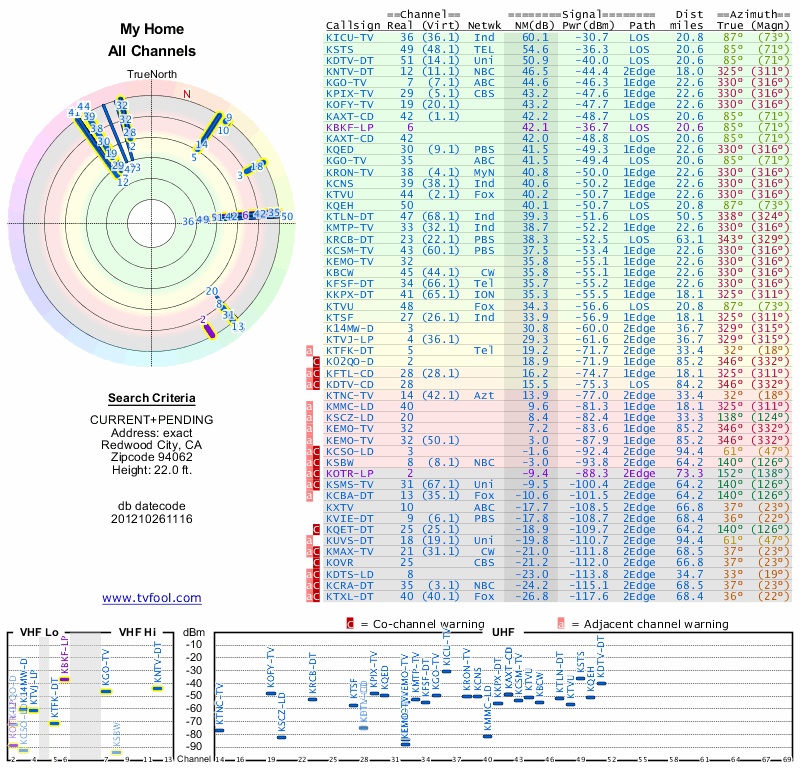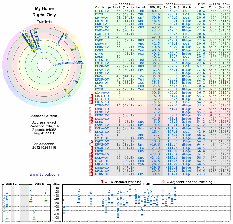 Here are the results for your location. The transmitter database was last updated on June 7, 2013. For more information about these plots and how to interpret them, please check out the Signal Analysis FAQ.