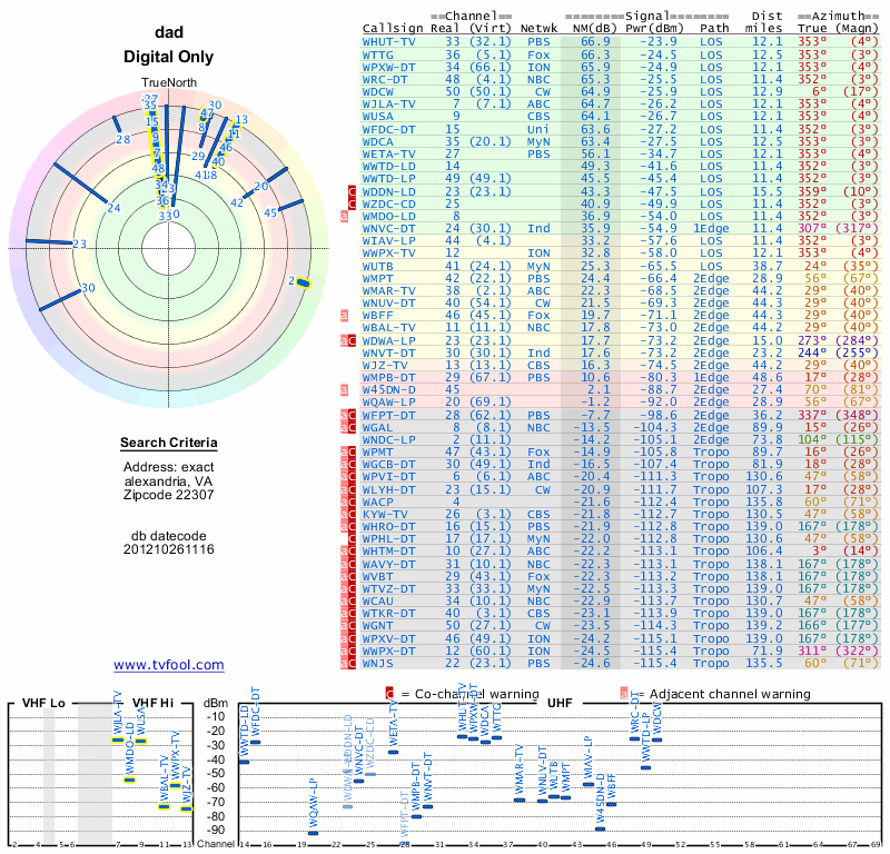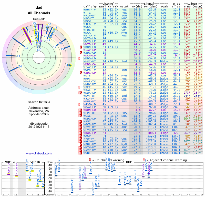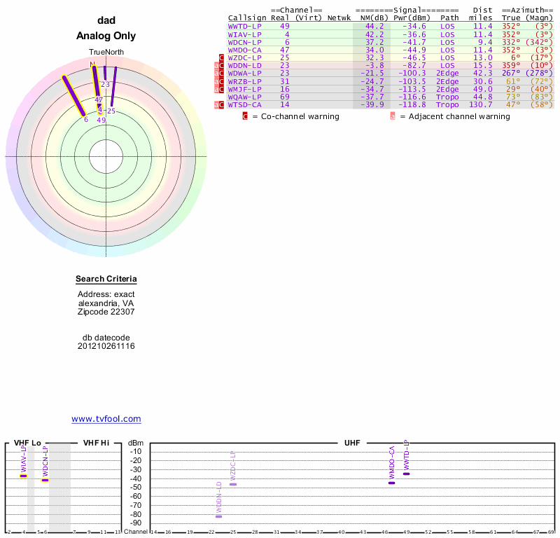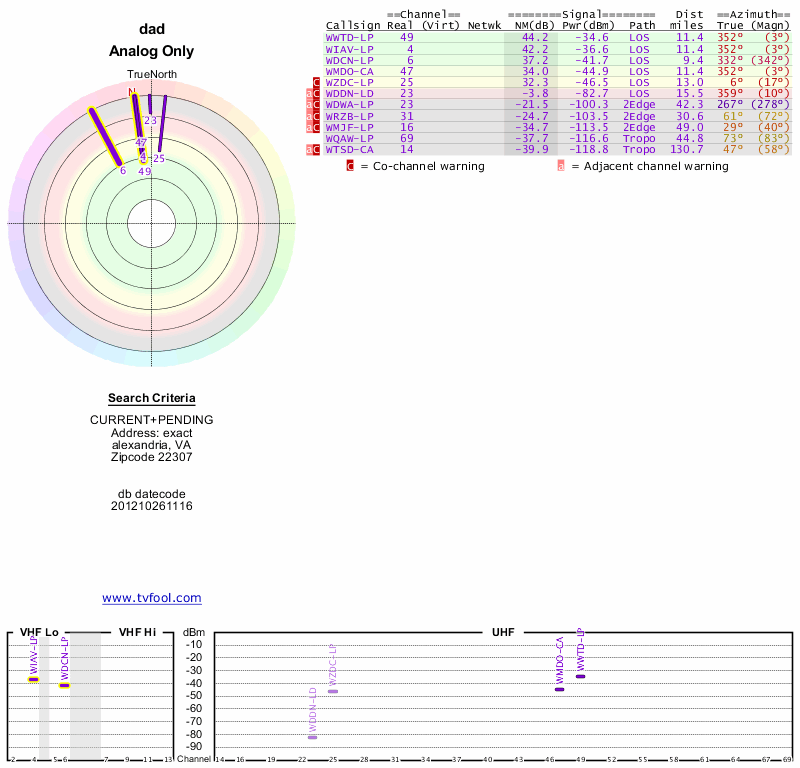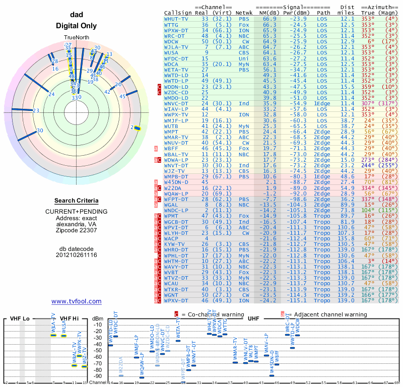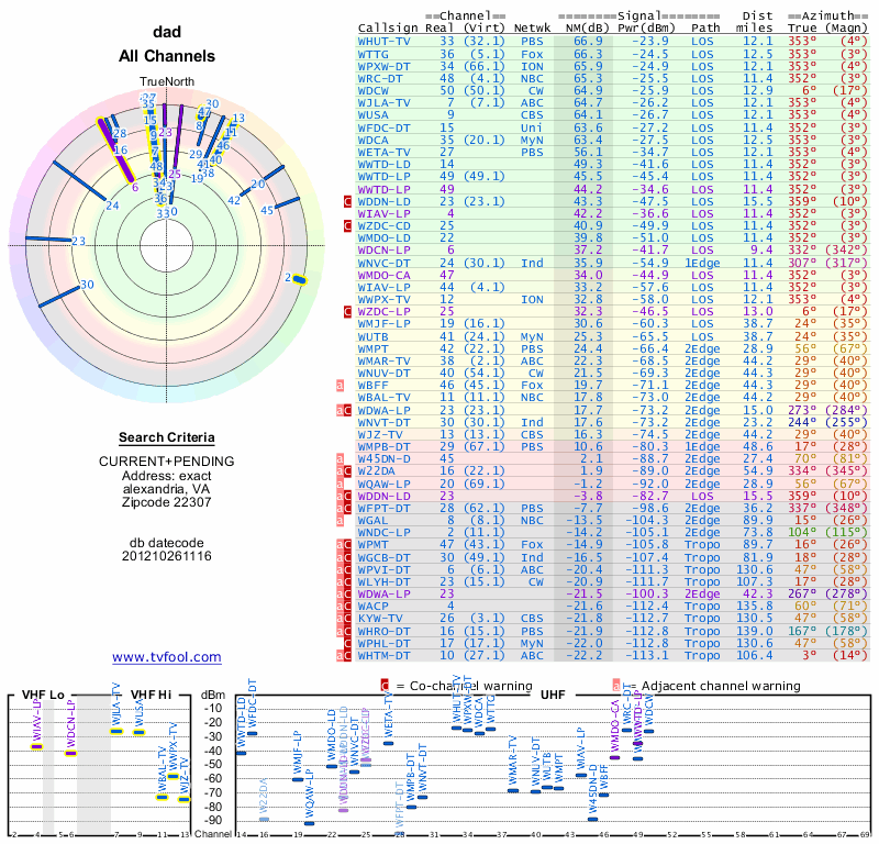 Here are the results for your location. The transmitter database was last updated on June 7, 2013. For more information about these plots and how to interpret them, please check out the Signal Analysis FAQ.