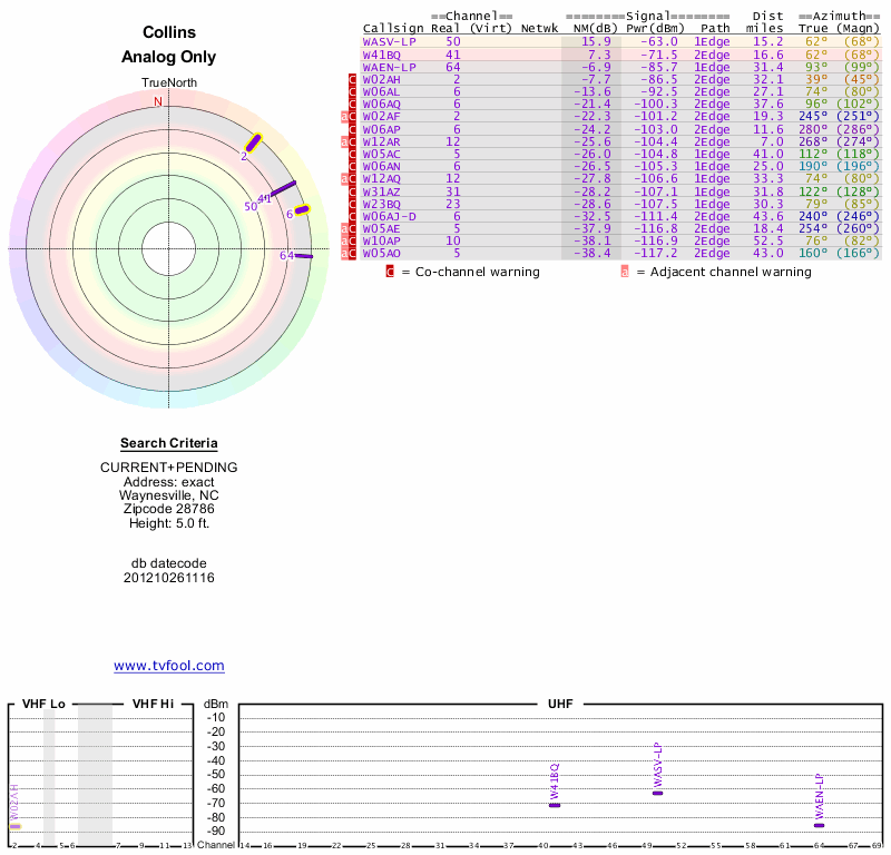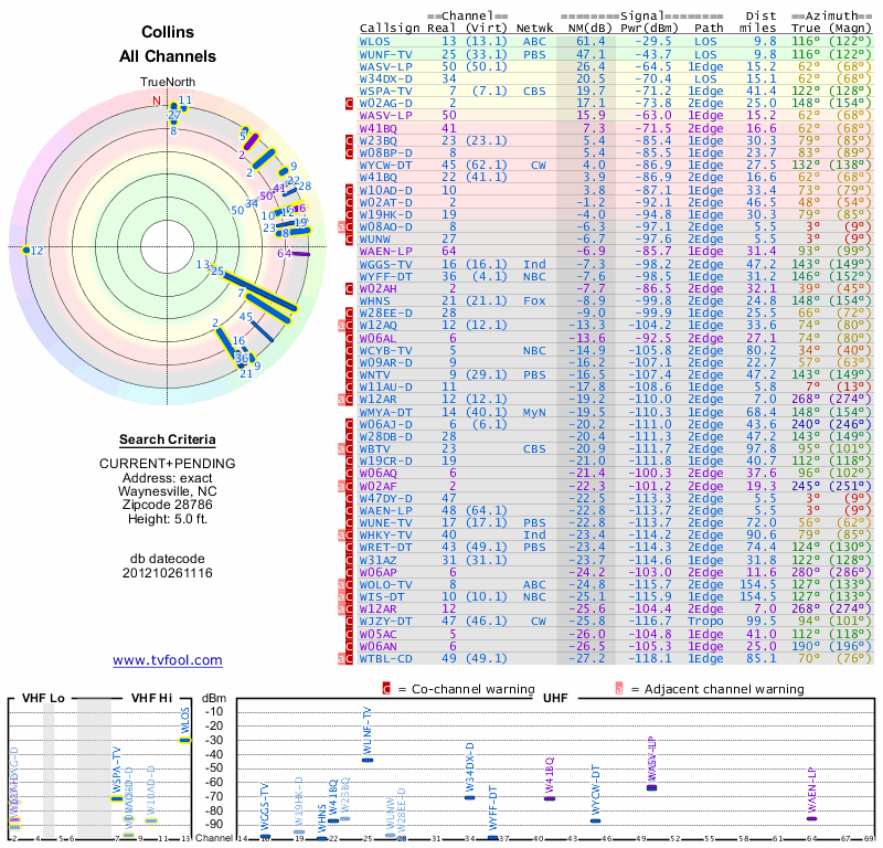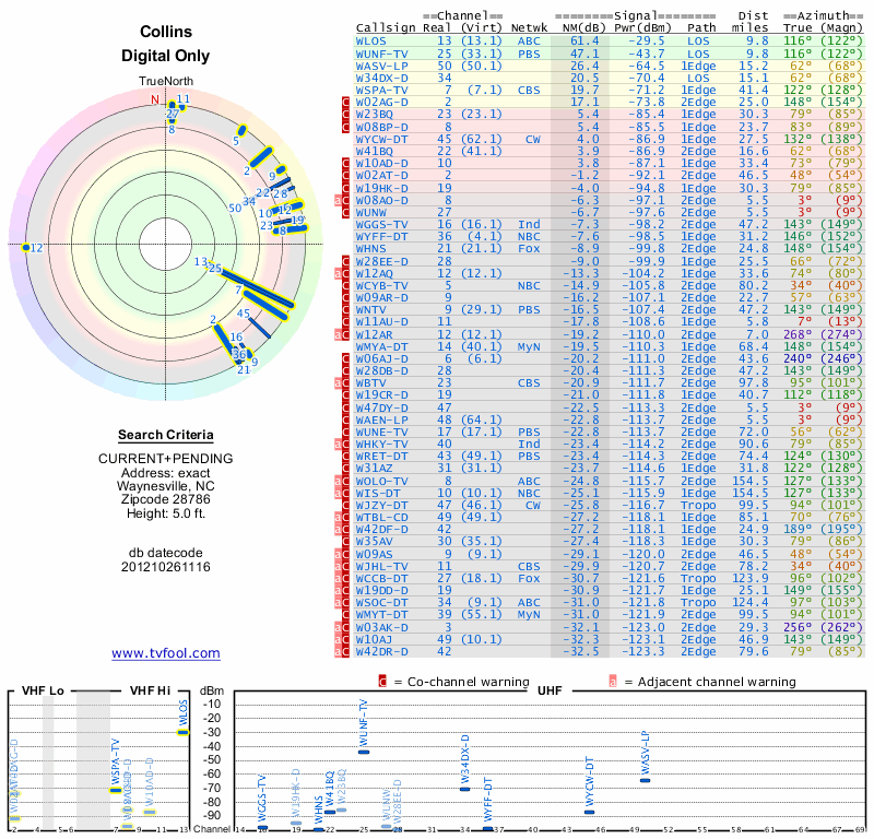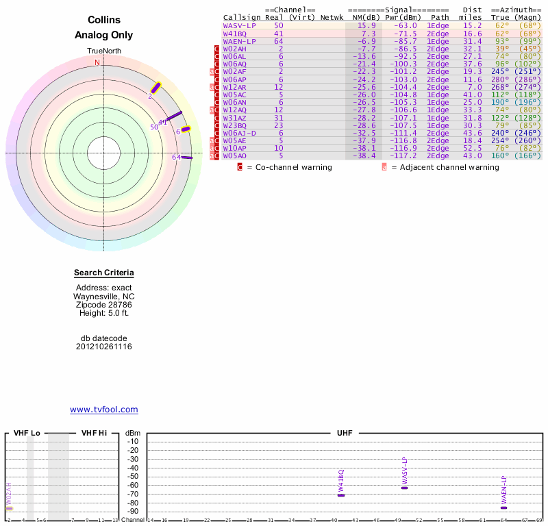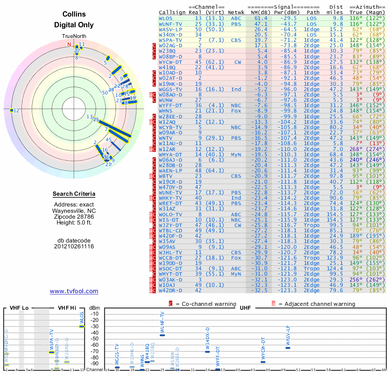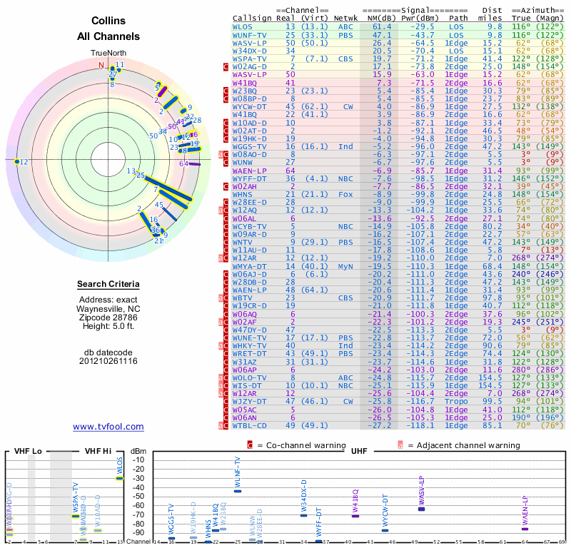 Here are the results for your location. The transmitter database was last updated on June 7, 2013. For more information about these plots and how to interpret them, please check out the Signal Analysis FAQ.