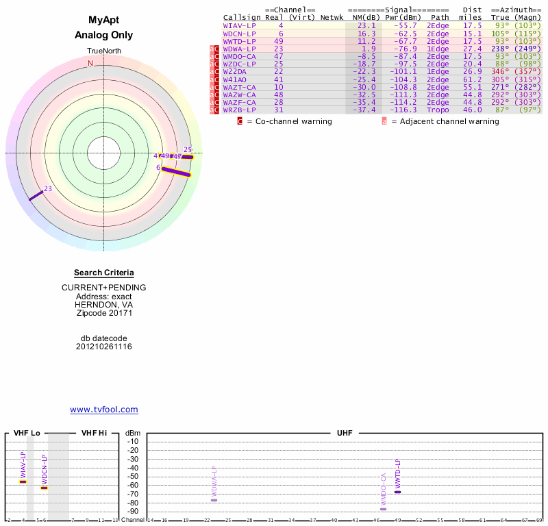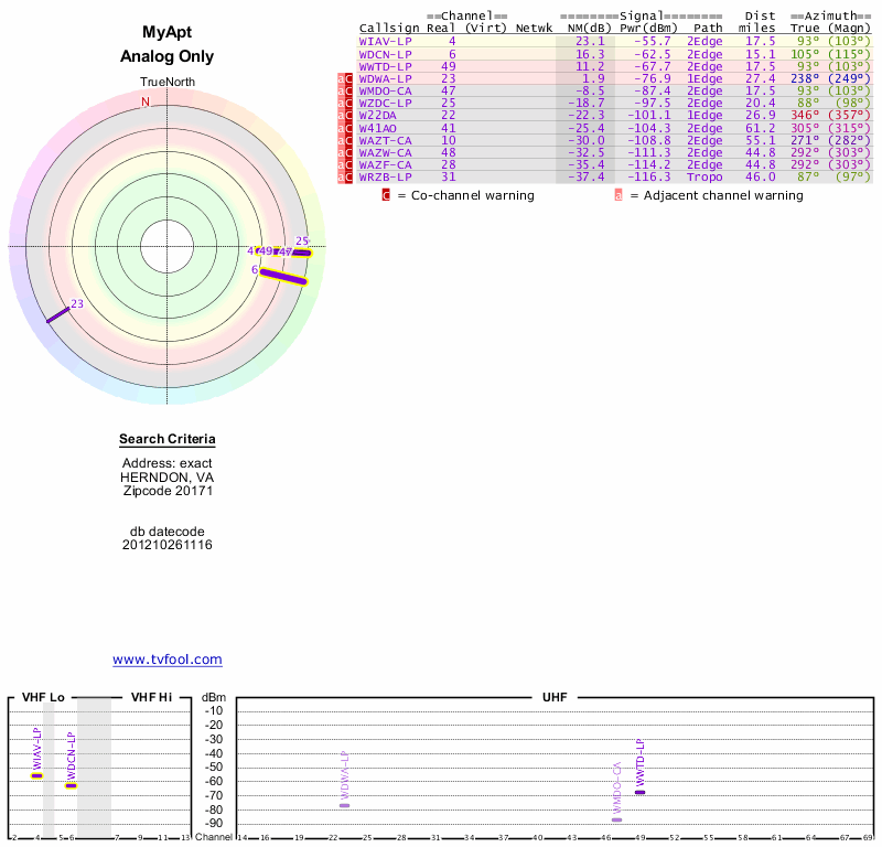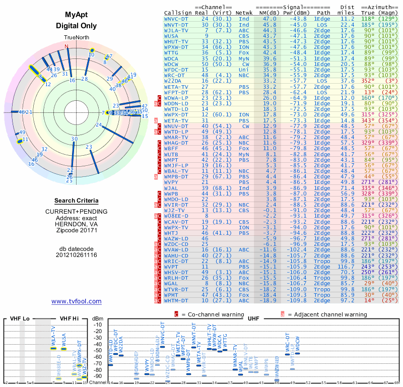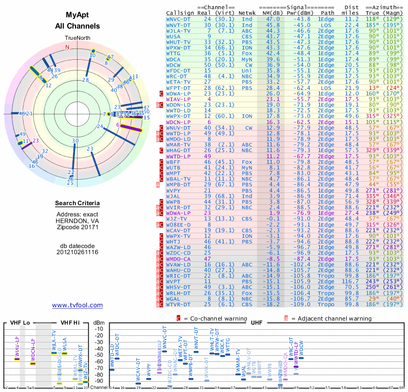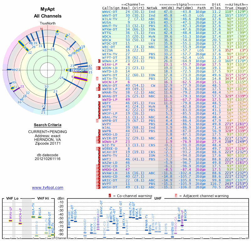 Here are the results for your location. The transmitter database was last updated on June 7, 2013. For more information about these plots and how to interpret them, please check out the Signal Analysis FAQ.