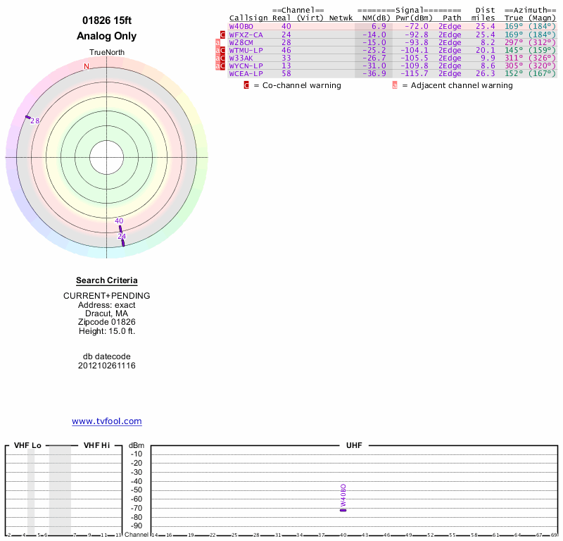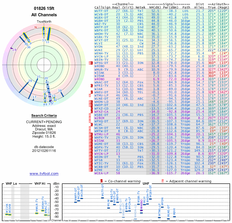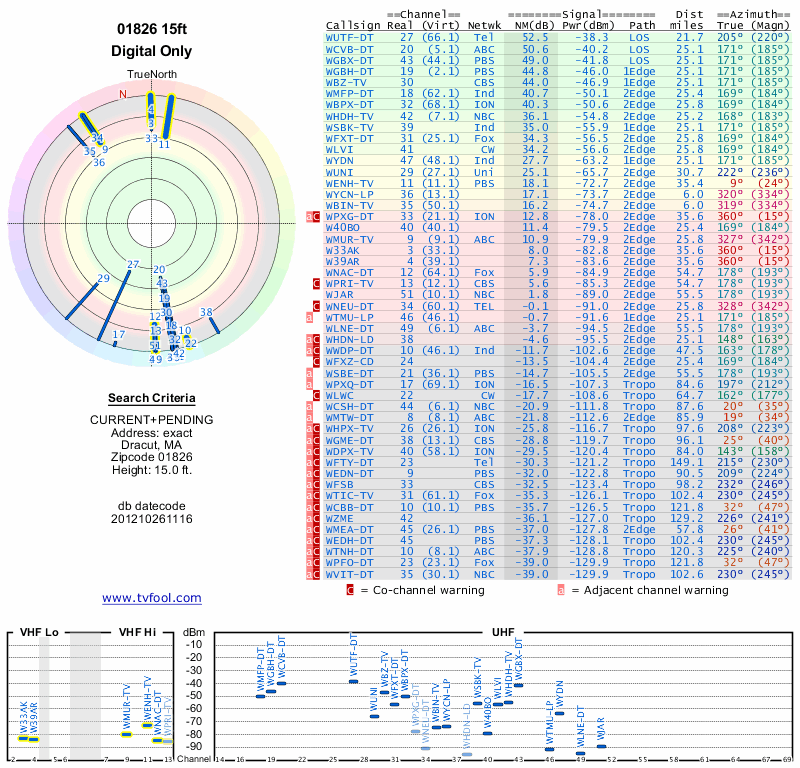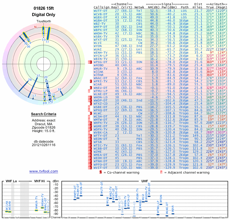 Here are the results for your location. The transmitter database was last updated on June 7, 2013. For more information about these plots and how to interpret them, please check out the Signal Analysis FAQ.