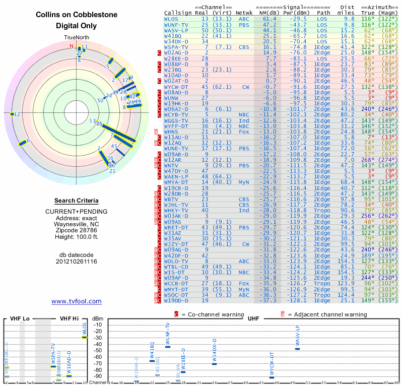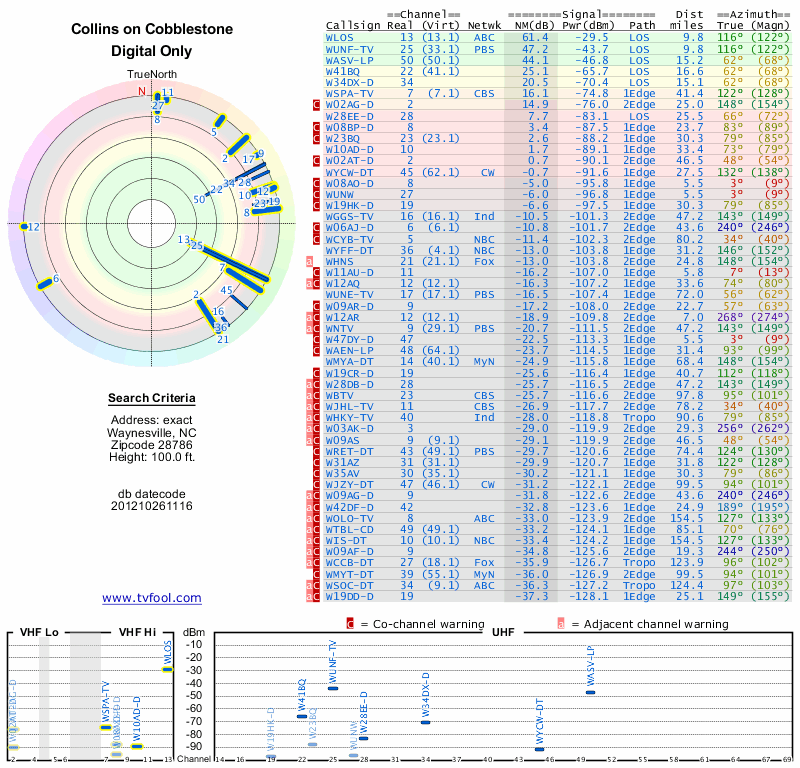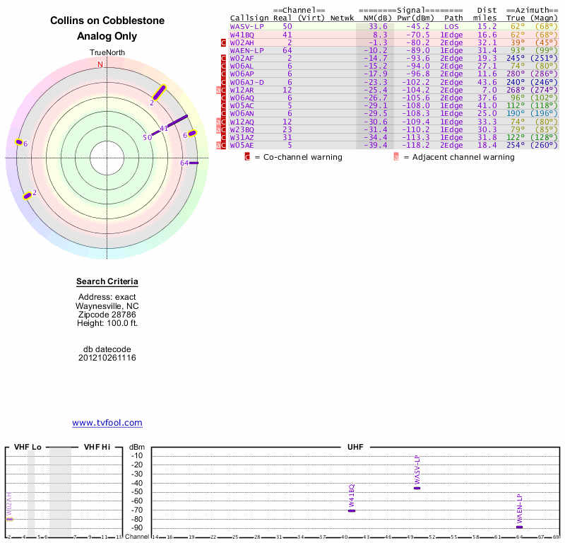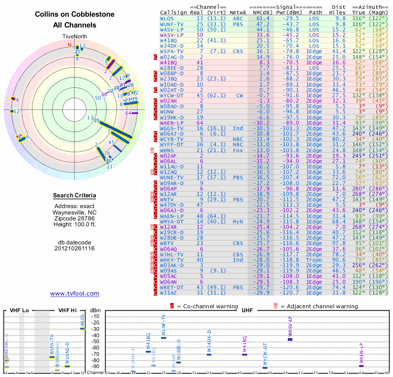 Here are the results for your location. The transmitter database was last updated on June 7, 2013. For more information about these plots and how to interpret them, please check out the Signal Analysis FAQ.