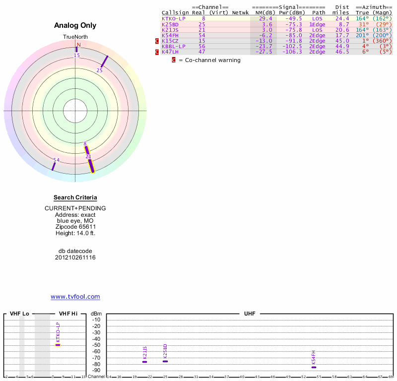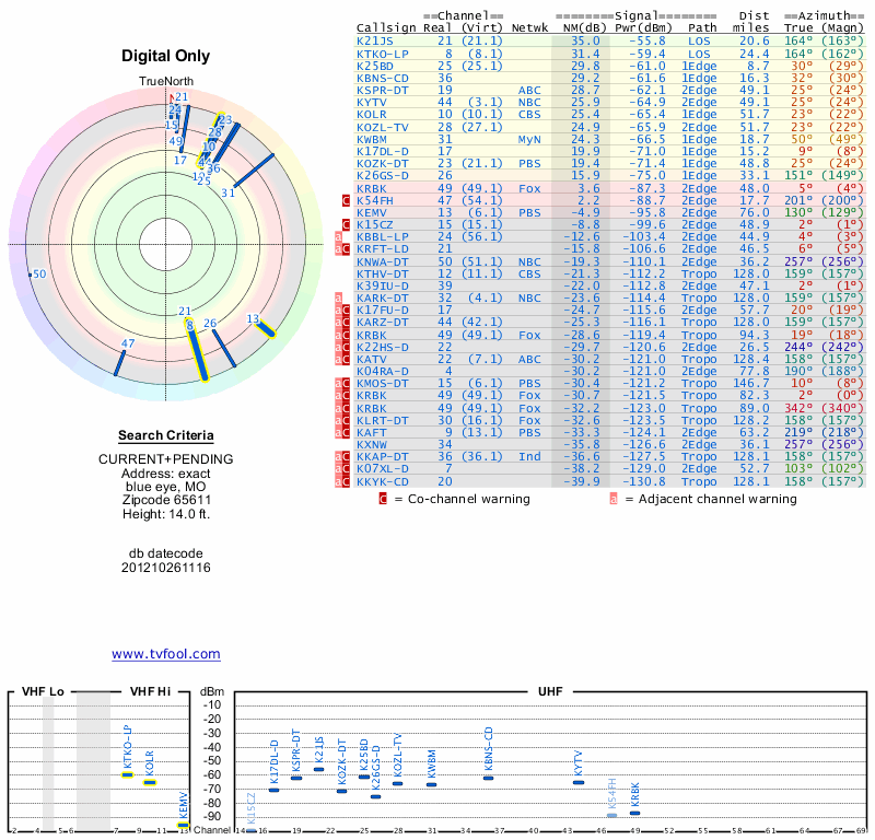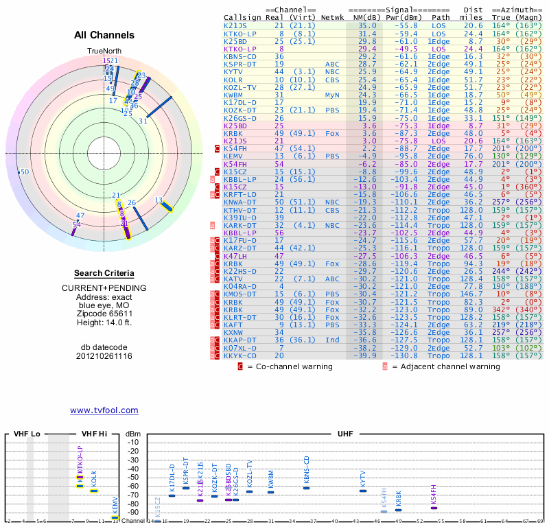 Here are the results for your location. The transmitter database was last updated on June 7, 2013. For more information about these plots and how to interpret them, please check out the Signal Analysis FAQ.