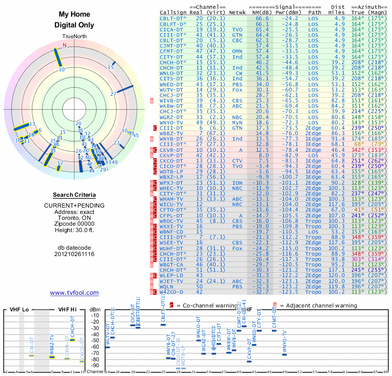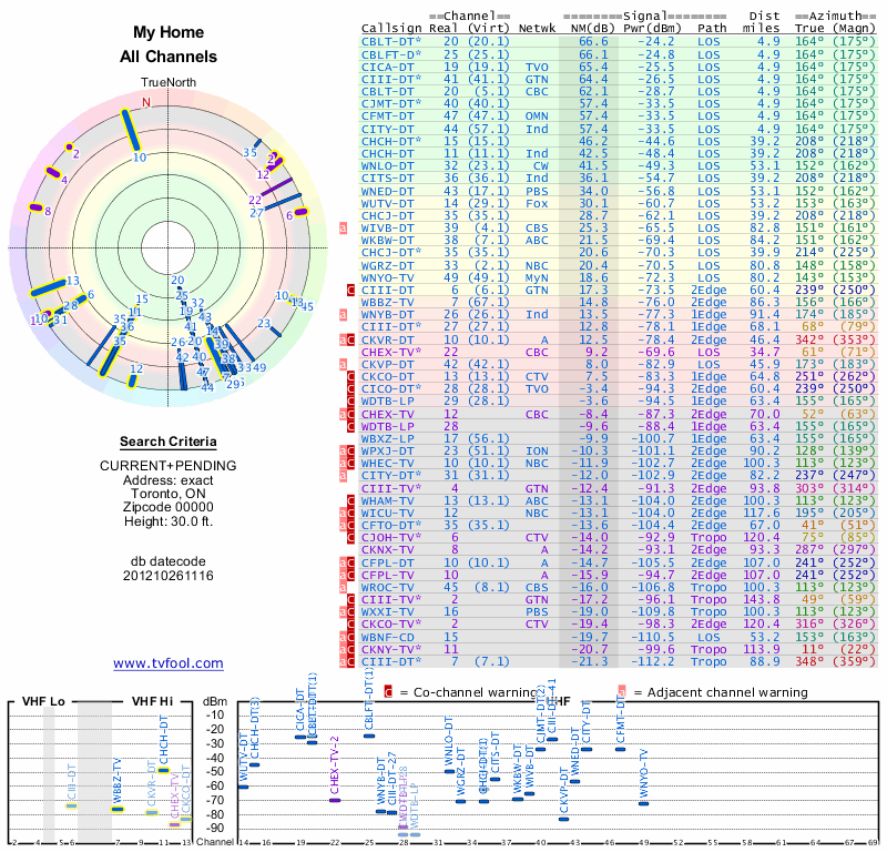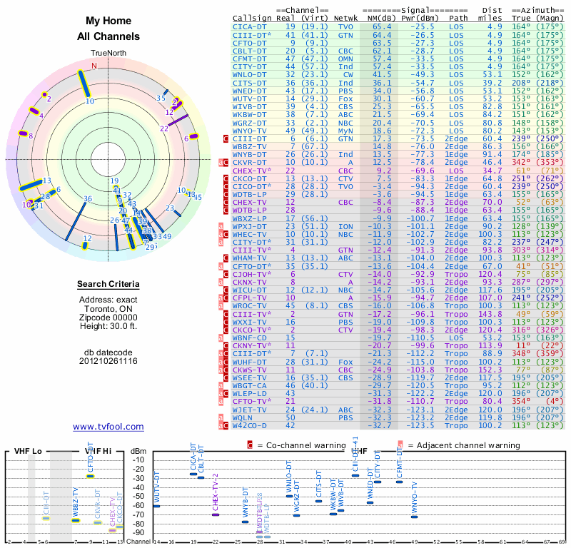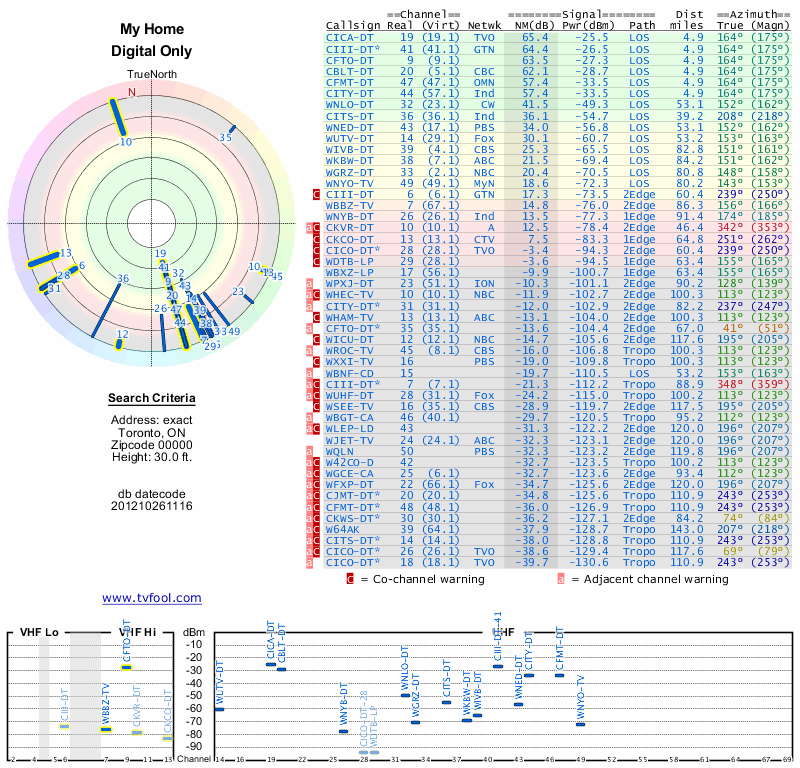 Here are the results for your location. The transmitter database was last updated on June 7, 2013. For more information about these plots and how to interpret them, please check out the Signal Analysis FAQ.