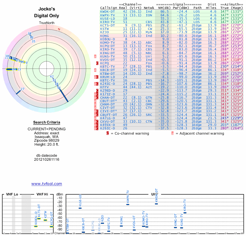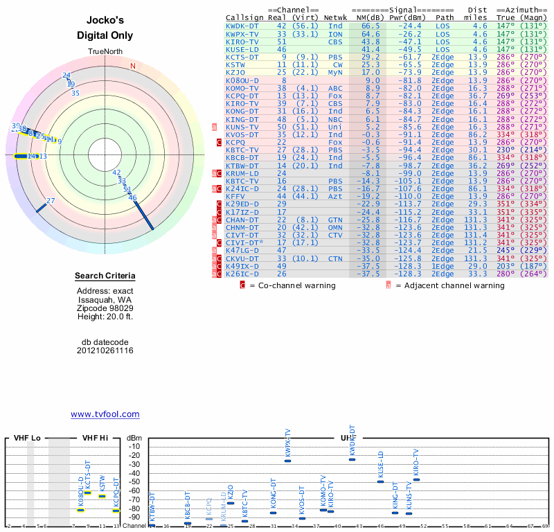 Here are the results for your location. The transmitter database was last updated on June 7, 2013. For more information about these plots and how to interpret them, please check out the Signal Analysis FAQ.