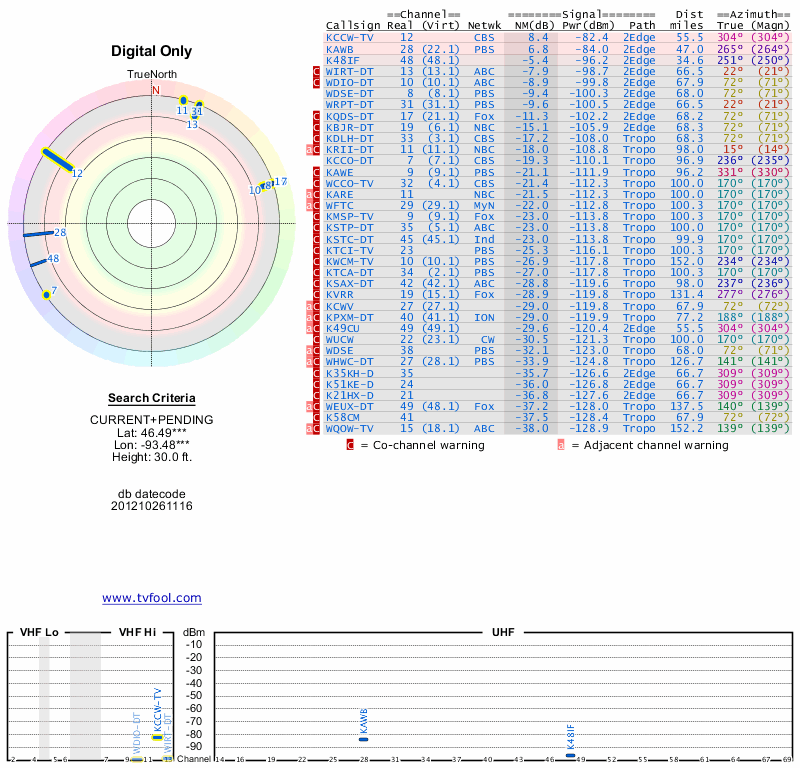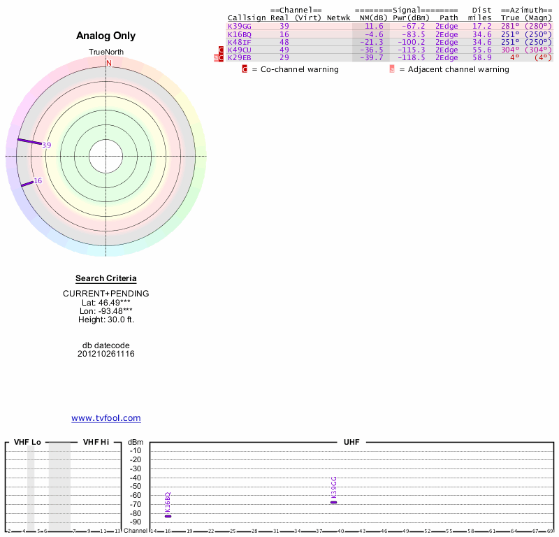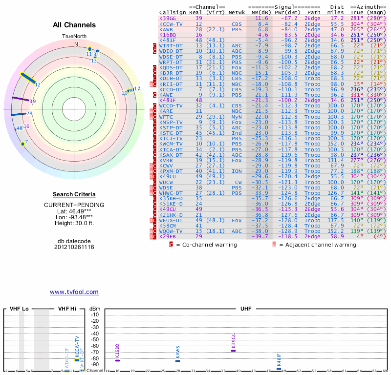 Here are the results for your location. The transmitter database was last updated on June 7, 2013. For more information about these plots and how to interpret them, please check out the Signal Analysis FAQ.