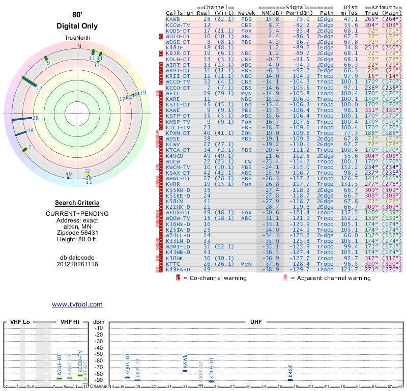 Here are the results for your location. The transmitter database was last updated on June 7, 2013. For more information about these plots and how to interpret them, please check out the Signal Analysis FAQ.