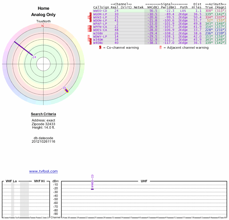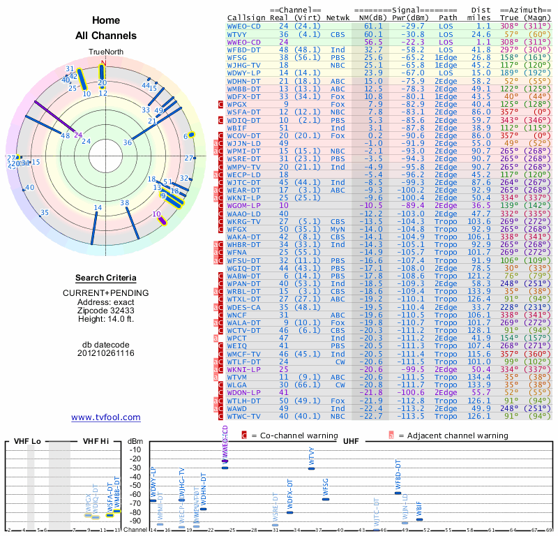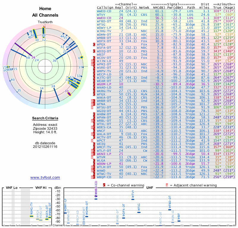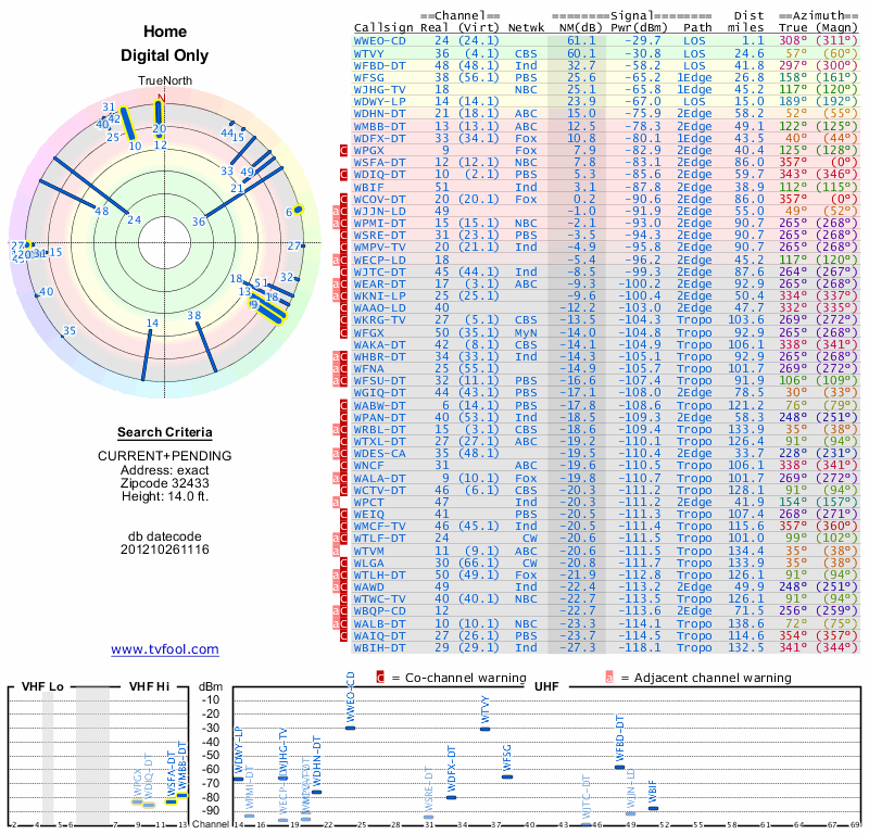 Here are the results for your location. The transmitter database was last updated on June 7, 2013. For more information about these plots and how to interpret them, please check out the Signal Analysis FAQ.