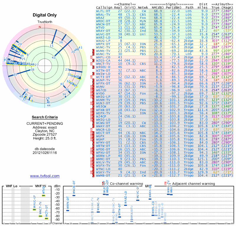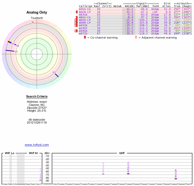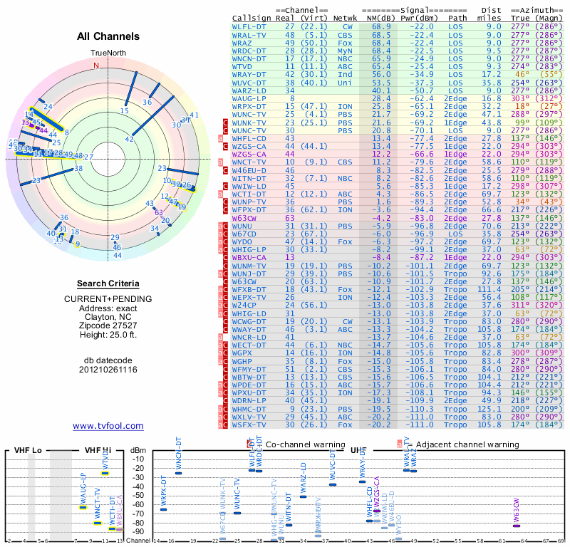 Here are the results for your location. The transmitter database was last updated on June 7, 2013. For more information about these plots and how to interpret them, please check out the Signal Analysis FAQ.