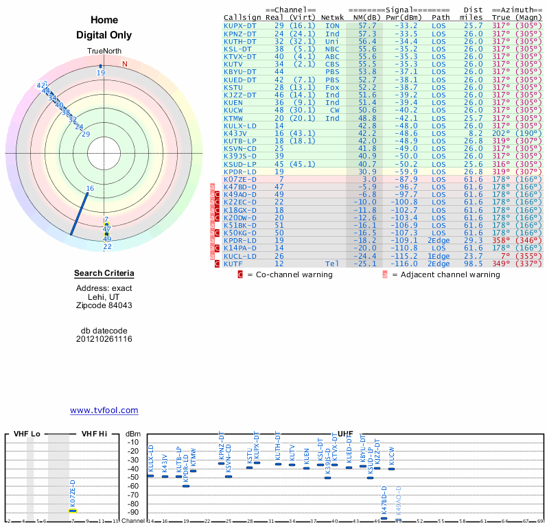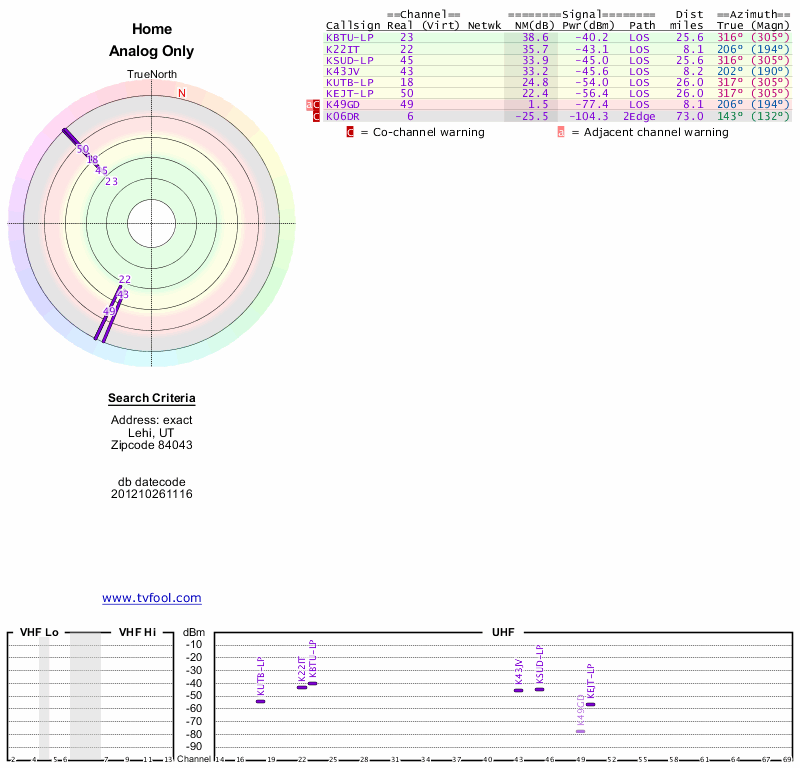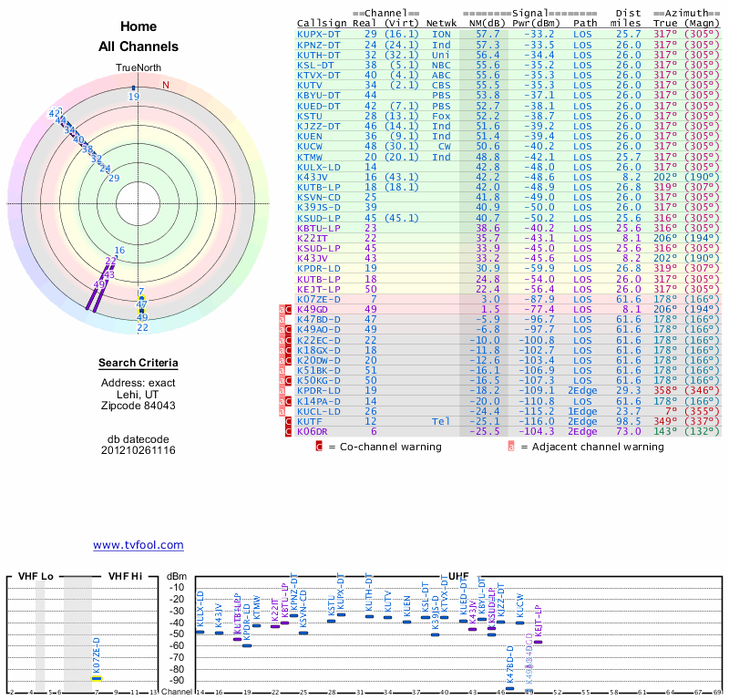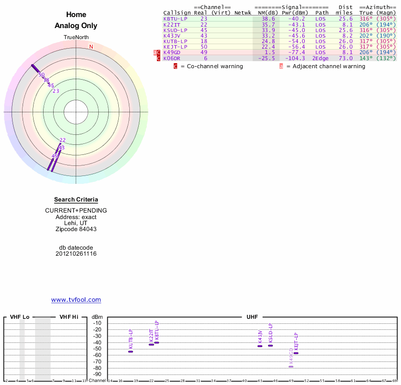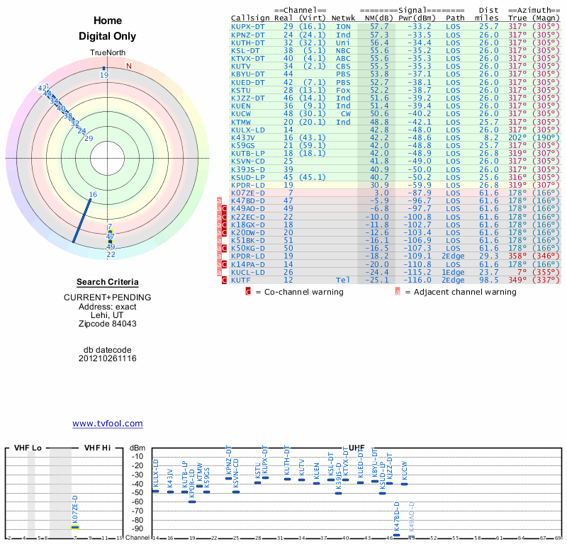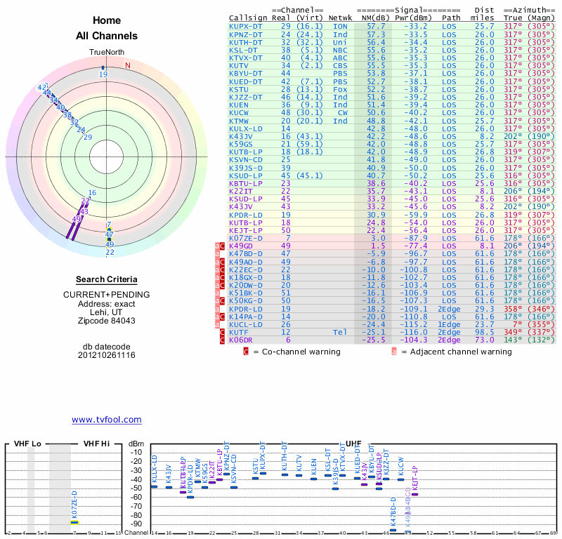 Here are the results for your location. The transmitter database was last updated on June 7, 2013. For more information about these plots and how to interpret them, please check out the Signal Analysis FAQ.