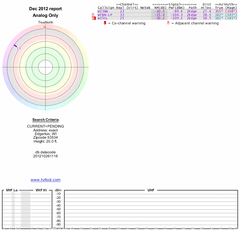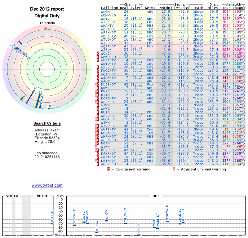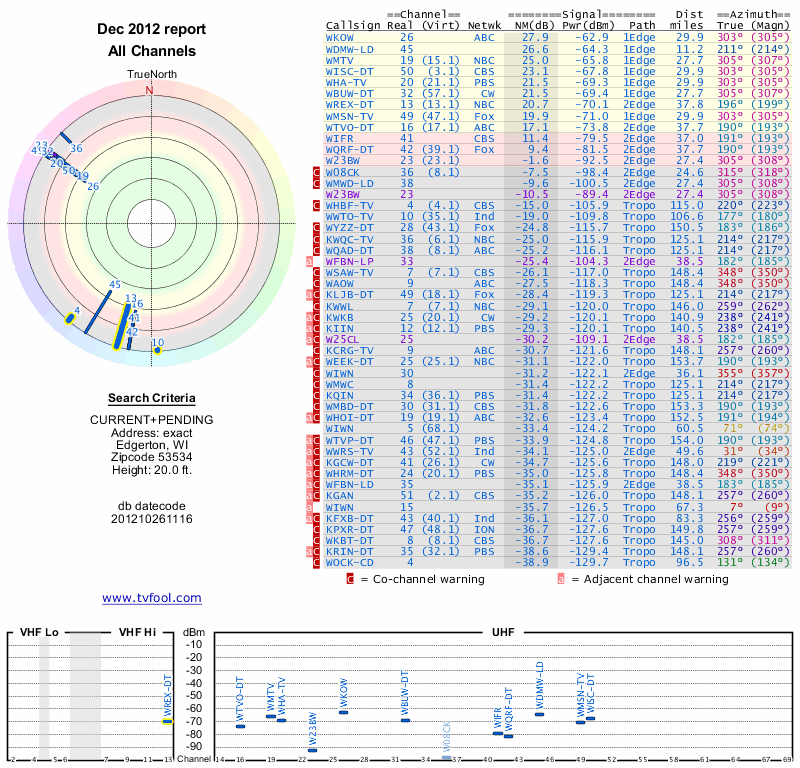 Here are the results for your location. The transmitter database was last updated on June 7, 2013. For more information about these plots and how to interpret them, please check out the Signal Analysis FAQ.
