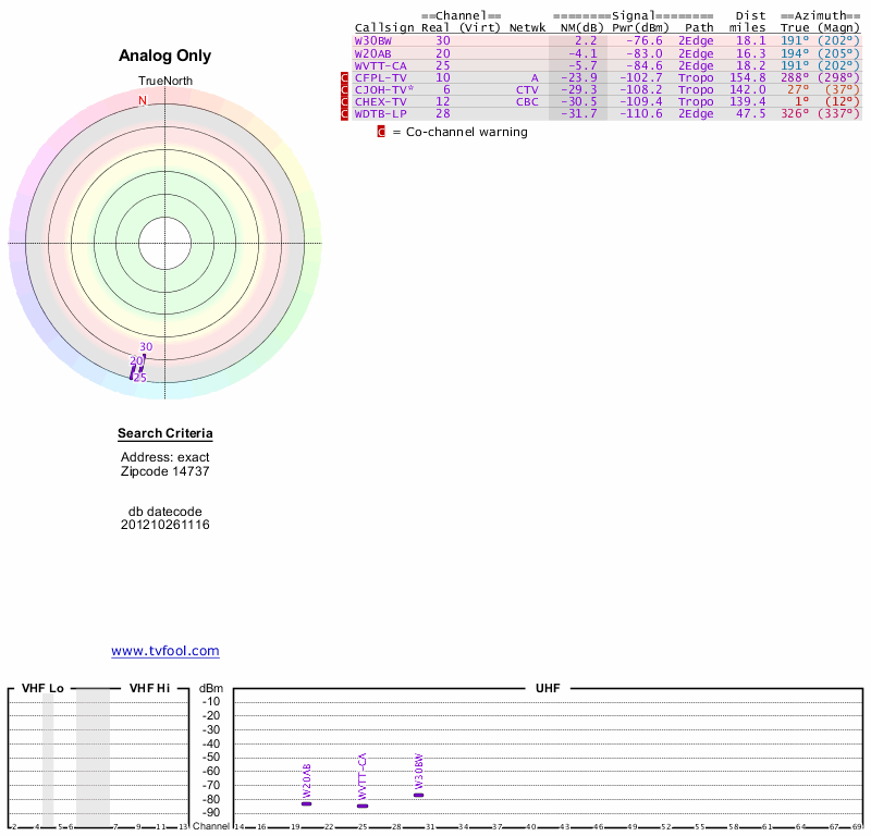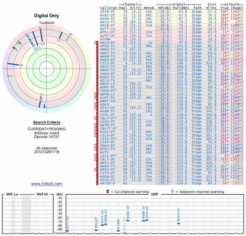 Here are the results for your location. The transmitter database was last updated on June 7, 2013. For more information about these plots and how to interpret them, please check out the Signal Analysis FAQ.
